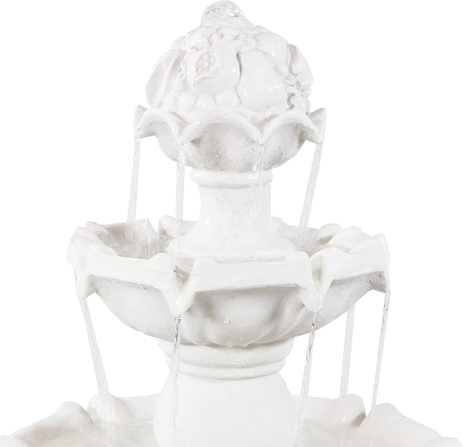- ELEGANT FOCAL POINT: The 3-tiered design with a fruit topper and white finish adds a sophisticated touch to gardens, patios, or landscaped areas. The backyard water fountain measures 31" in diameter x 52" H with a 14.5" diameter base. The fountain weighs 50 lbs and has a 8.5-gallon water capacity.