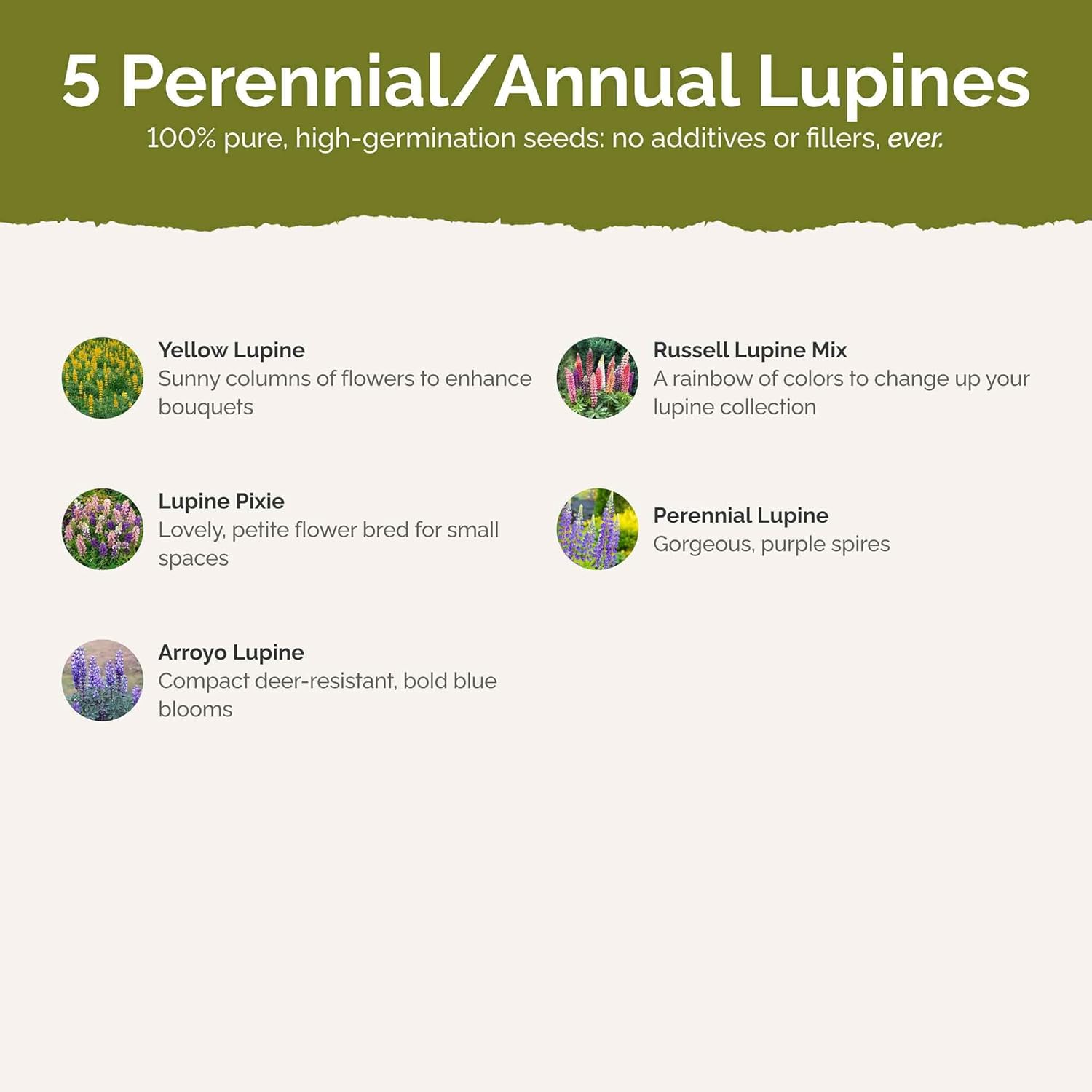 - 100% Pure, Non-GMO Seeds - No fillers, favorites only! Includes 7 easy-to-grow species: Russell Lupine, Arroyo Lupine, Wild Perennial Lupine, Dwarf Lupine Pixie, Pygmy Leaf Lupine, Sky Lupine, Yellow Lupine