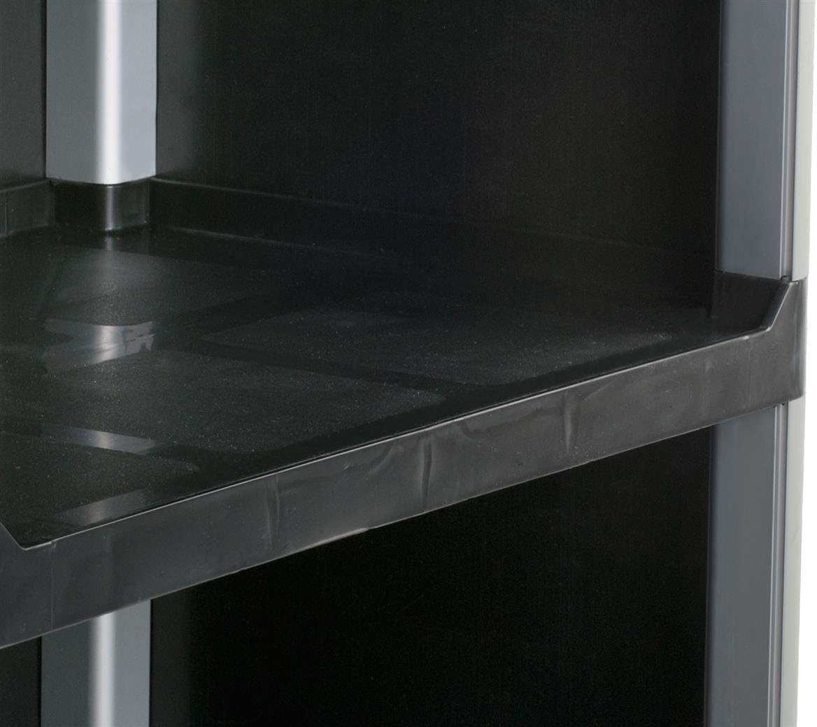 - Textured shelves prevent items from moving out of place; raised lip along the edge keeps spills contained.