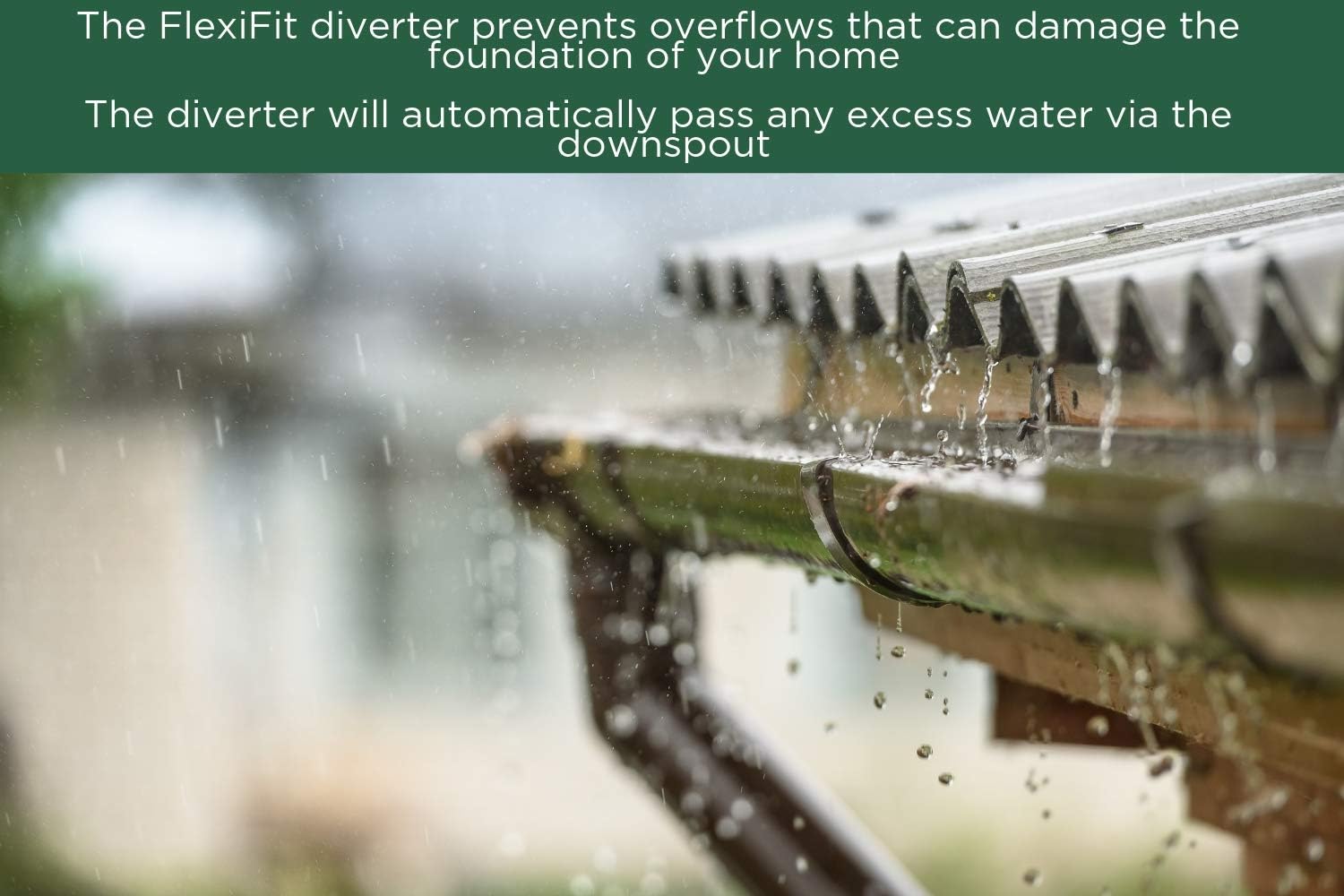 - PATENTED TECHNOLOGY – Flexi Fit rain diverter for downspout prevents overflows that can damage the foundation of your home. The rain water diverter for gutters will automatically pass any excess water via the downspout