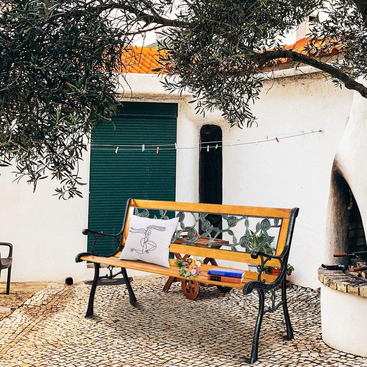 Giantex 50'' Patio Park Garden Bench, Outdoor Furniture Rose Cast Iron Hardwood Frame Porch Loveseat for 2 Person Outdoor Clearance