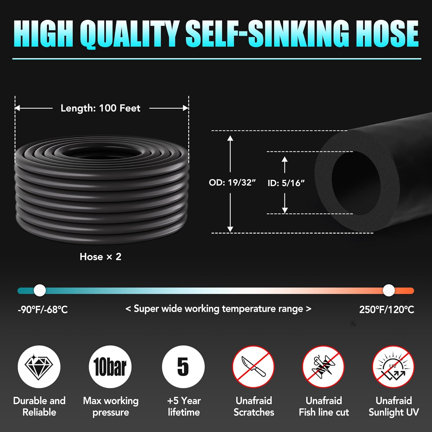 - 100ft, 5/16" ID, 5/8" OD self-sink rubber air hose Two roll. 10 hose clamps, 1 tee brass barb fitting, 2 straight barb fittings included.