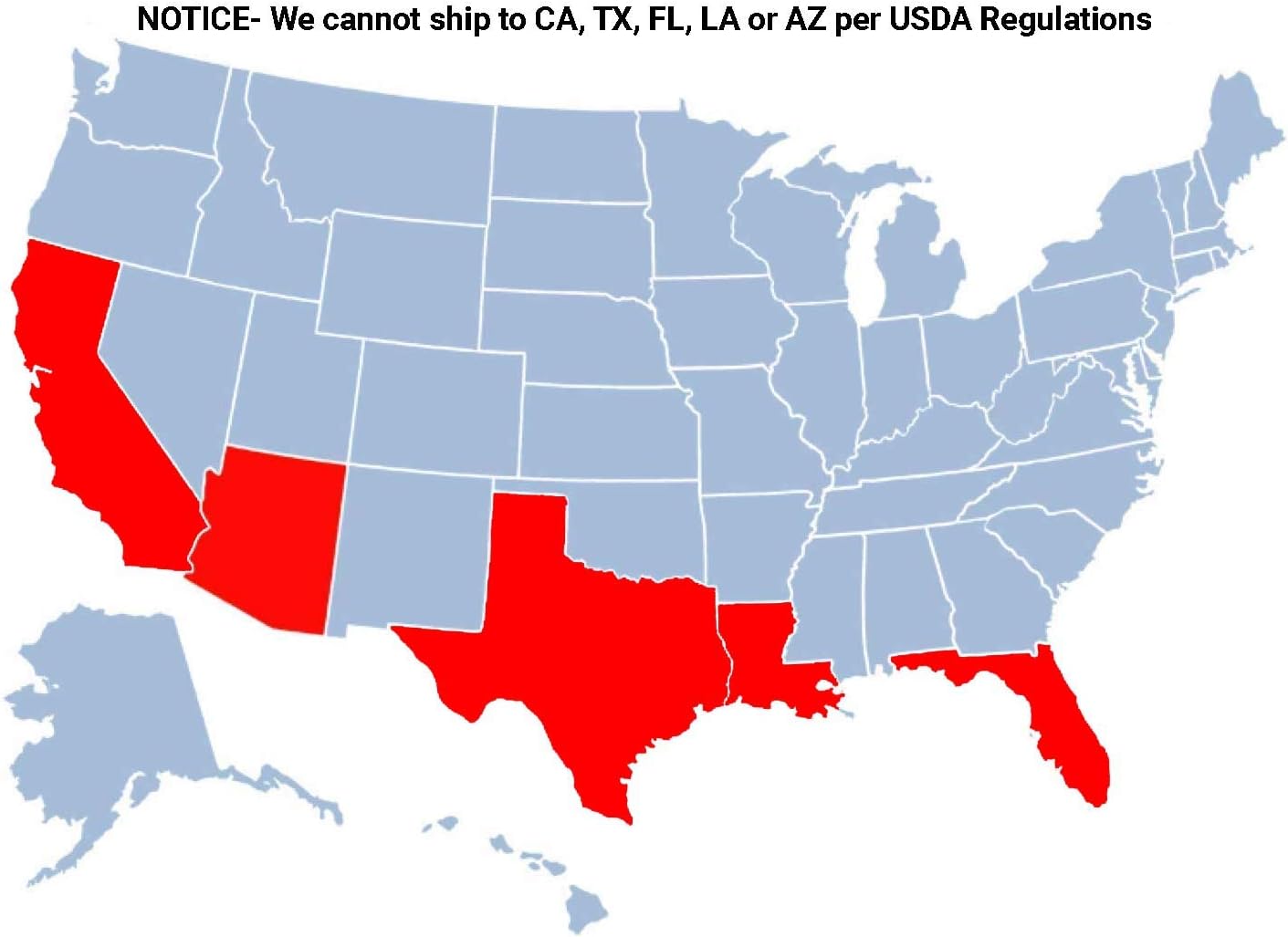 - Restrictions: This product cannot be shipped to AL, AZ, CA, FL, GA, LA, OR, TX, MS due to federal restrictions. If you order the product to be sent to any of these areas, your order will be cancelled