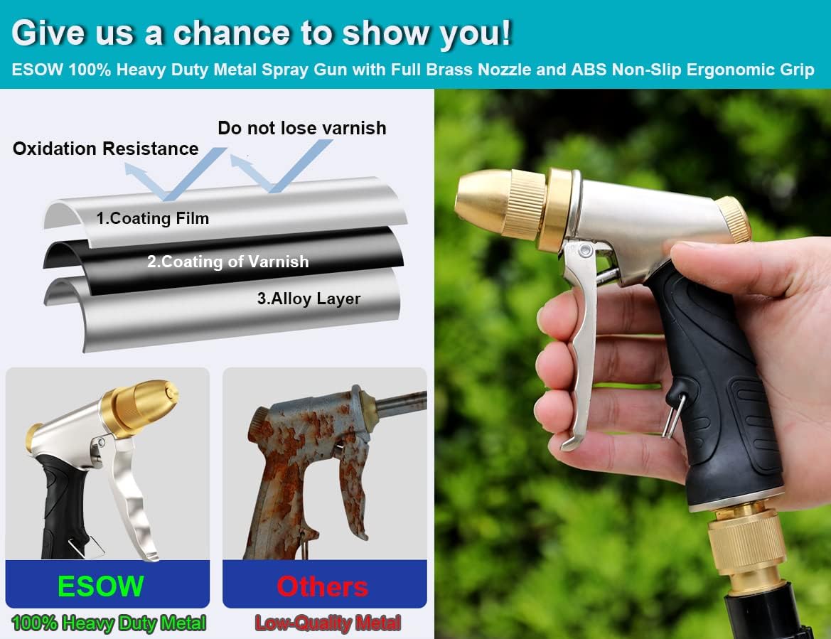 - [ADVANCED MATERIAL]: Made of 100% metal construction built and brass head, durable and powerful. Full soil brass nozzle & zinc alloy gun body. Metal body with rubberized outer coating, easy to grip, slip-resistant and comfortable fit. Gun is much stronger than plastic ones and built to last. ESOW garden hose nozzle perfects for Watering Your Garden, Lawn, Grass, and Flower Beds. It's also great for Washing Your Car, Dogs, and Pets.