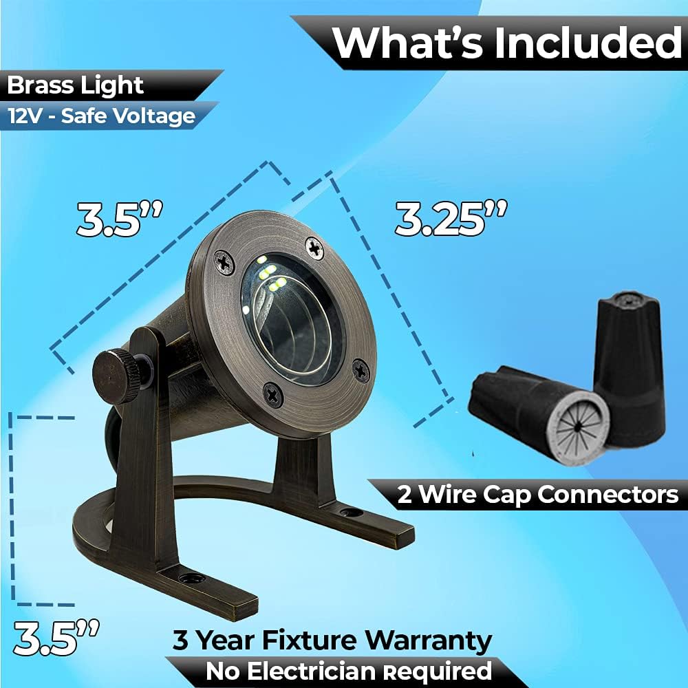 - {What's Included} Our waterproof heavy duty patio pond underwater led lights will light up your pool waterfall, outdoor pond, fountain, water statue, stream, pond rocks and add water light effect. Includes beautiful finish brass led underwater lights low voltage led landscape lighting with adjustable brass knuckle, silicone filled connectors and pre-wired with 25ft insulated low voltage cable that does not require additional piping or conduit for installation of the underwater fountain lights
