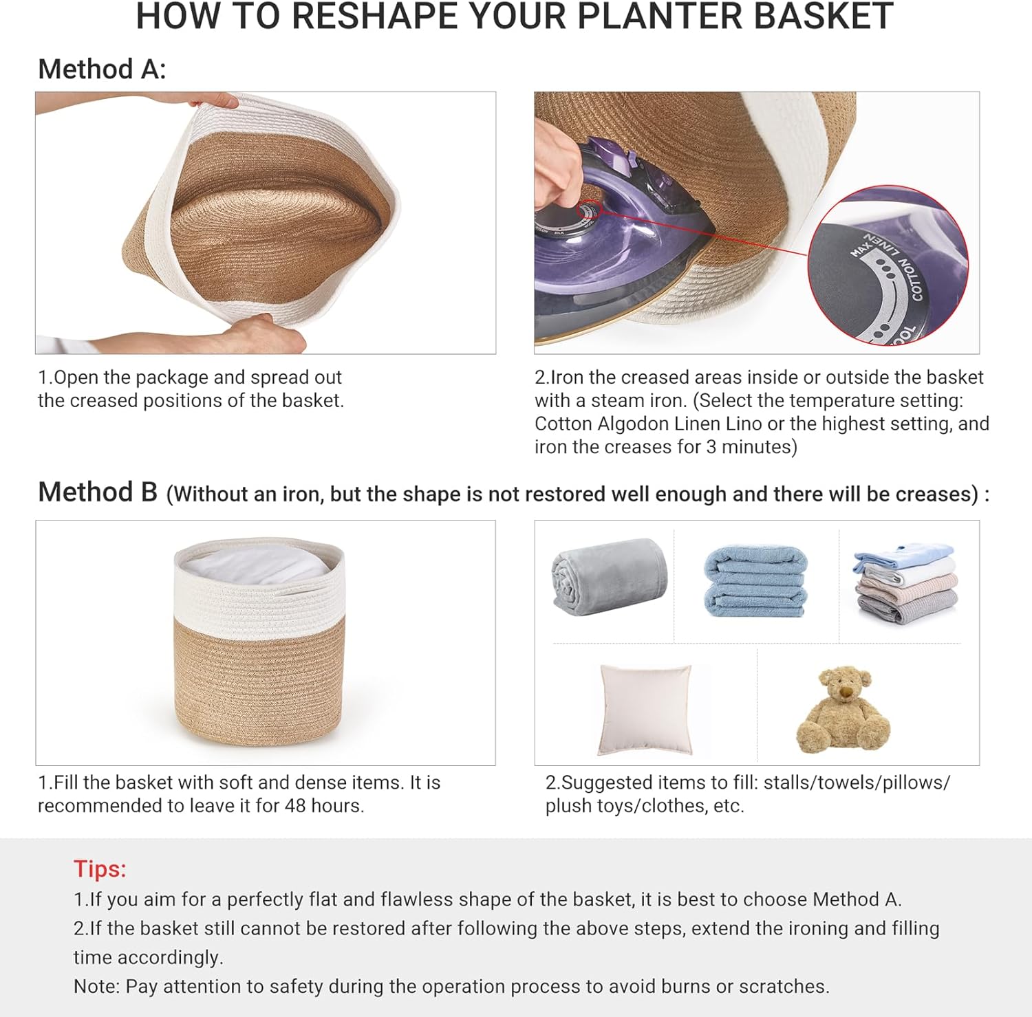 - Home Decor: Add this simple, organic embellishment in your house to brighten up your daily life. NOTE: The basket is folded when shipping, it will turn back to its elegant shape when you stuff up it with some towels or blanket, and iron is a good idea. Giving it as a gift for a baby shower,or Mother,s Day Father,Day ,housewarming