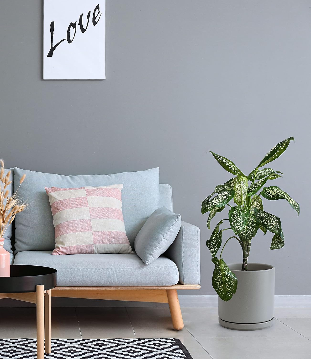 D'vine Dev 10 Inch Ceramic Planter Pot with Drainage Hole and Saucer, Indoor Cylinder Round Planter Pot, Grey, 94-O-E-3