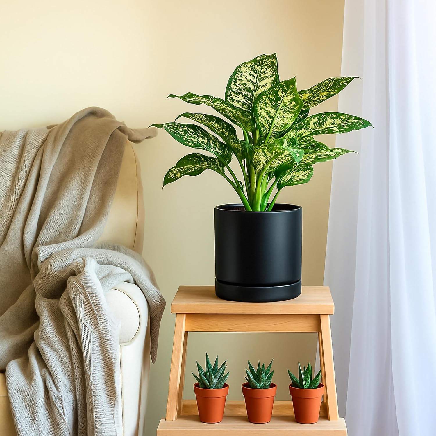 D'vine Dev 8.2 Inch Ceramic Planter Pot with Drainage Hole and Saucer, Indoor Cylinder Round Planter Pot, Black, 94-O-D-2