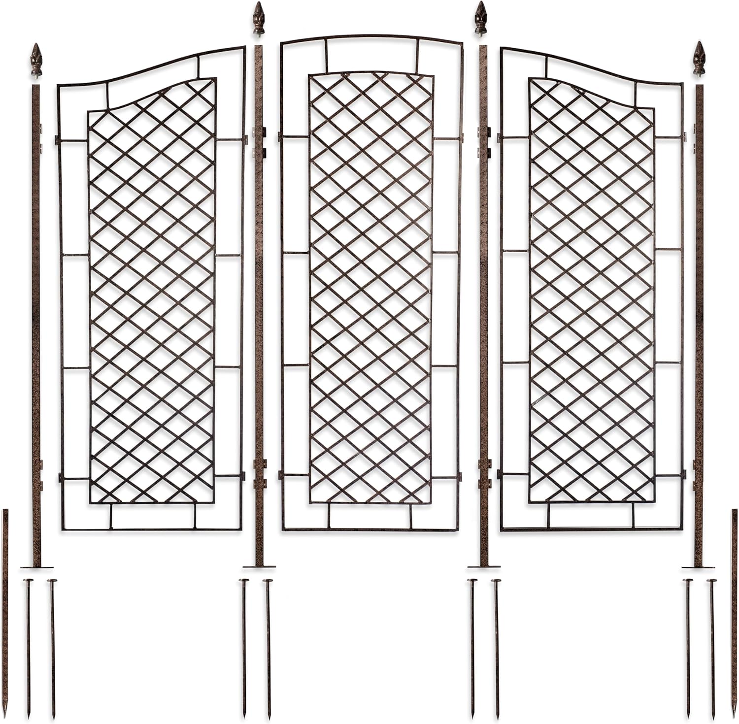 - Built to last β Packaged in 2 boxes and requiring minor assembly, this iron trellis is ideal for growing vines or to create private space. At widest outer points at the base of the trellis with the 'feet' you will find dimensions of 79.25 inches. The main section of the trellis is 75.25 inches side to side. The overall height of the trellis at the highest point is 71 inches tall plus 18 inch ground spikes. This heavy-duty trellis offers a secure anchoring system to support large plant material.