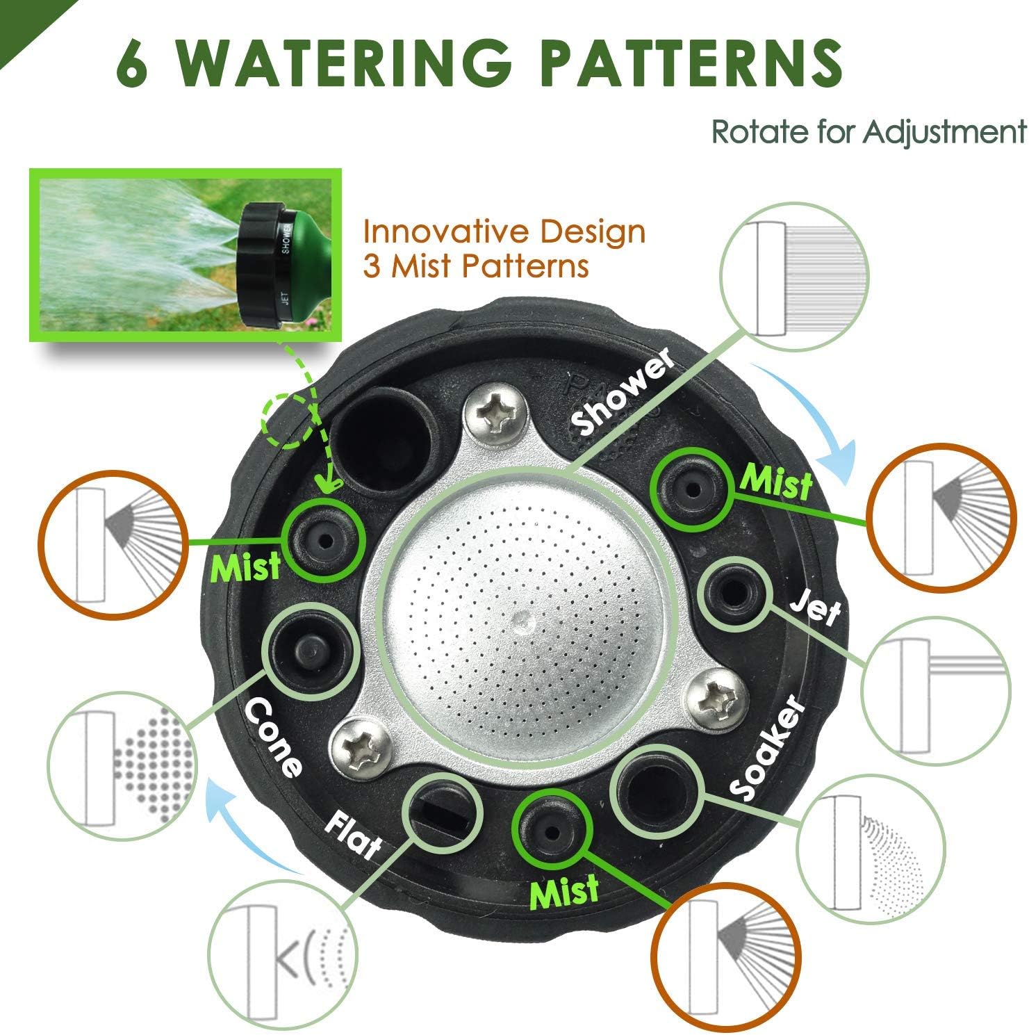 - Fits Standard Garden Hoses: 6 spray patterns, to change patterns simply twist the nozzle