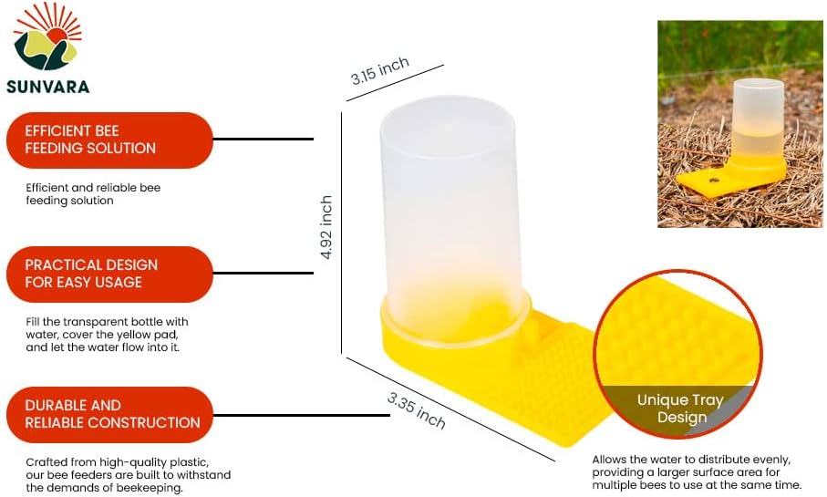 - π EFFICIENT BEE FEEDING SOLUTION Sunvara Bee Feeder revolutionizes beekeeping by providing an efficient and reliable bee feeding solution. With our bee watering station, you can effortlessly nourish your honeybees and ensure their well-being. Save time and energy with this easy-to-use bee feeder, allowing you to focus on other aspects of beekeeping.
