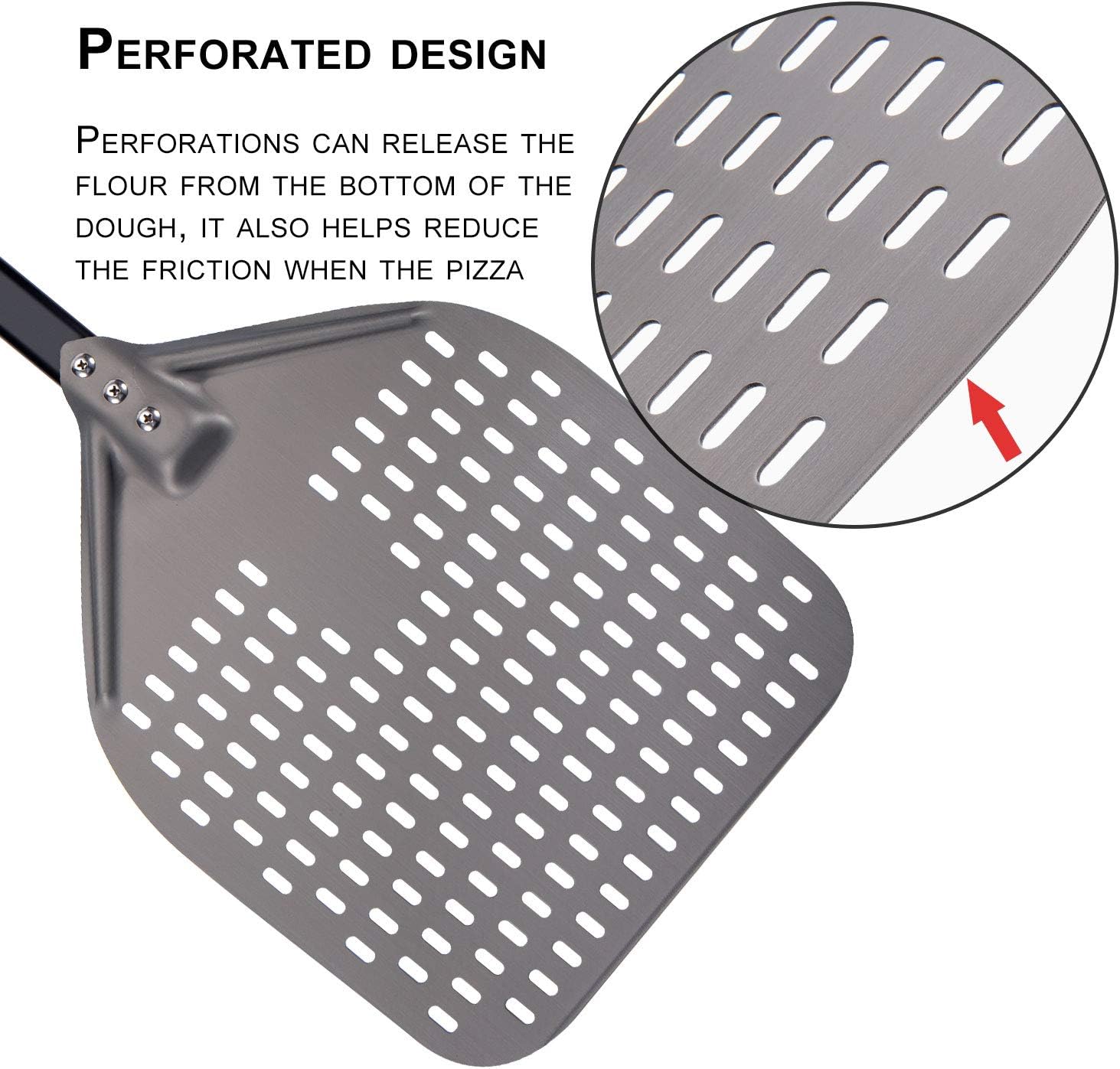- 【RECTANGULAR PERFORATED HEAD】The 12" x 15" milled aluminum head boasts a beveled edge for easy handling, allowing pizzas to slide in smoothly. The perforated design of pizza spatula reduces the need for excessive cornmeal or flour, ensuring your pizza comes out crispier and more flavorful, with less sticking
