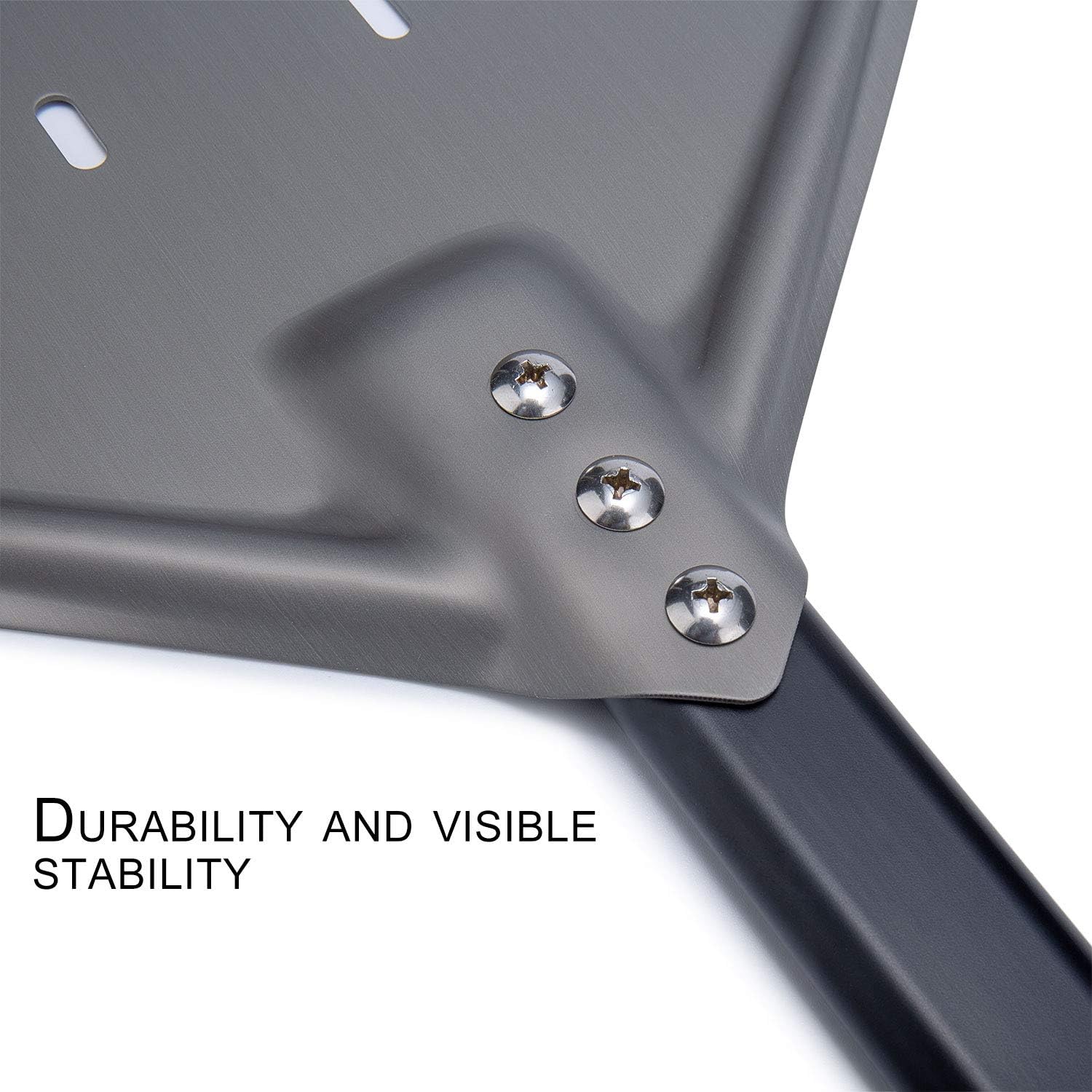 - 【PREMIUM QUALITY】Crafted from hard anodized aluminum, our pizza peel protects your dough from oxidation. The durable pizza paddle is designed to last 6 to 8 times longer than standard pizza peels, ensuring you have a reliable kitchen tool for years to come