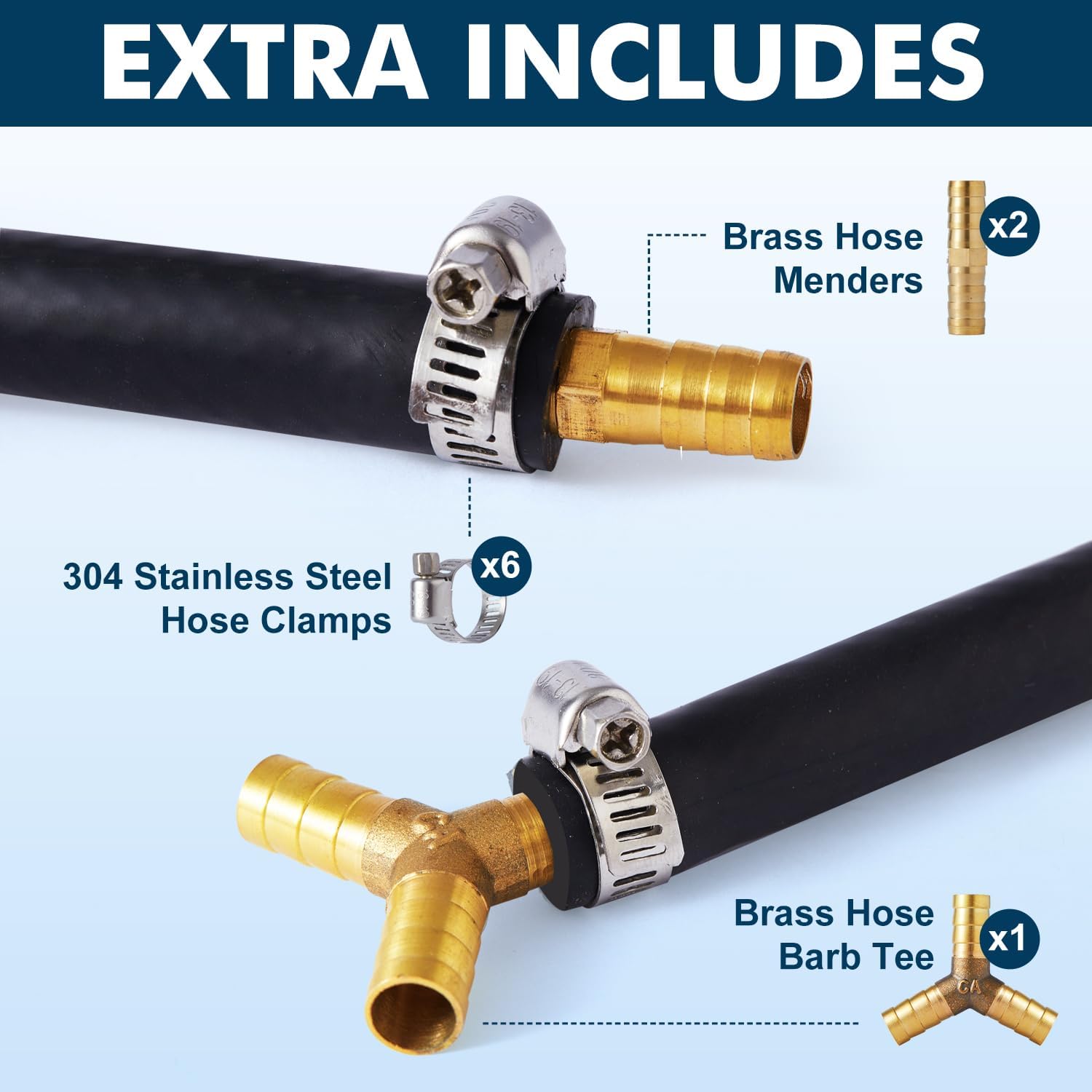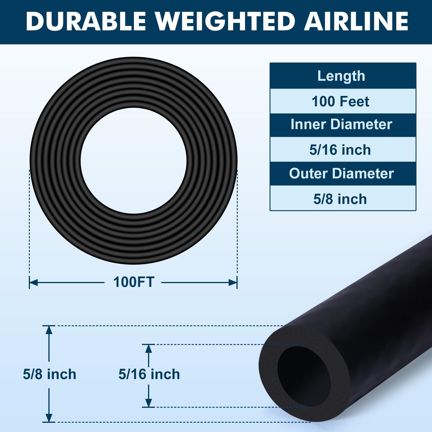 - 100ft, 5/16" ID, 5/8" OD self-sink rubber air hose One roll. 10 hose clamps, 1 tee brass barb fitting, 2 straight barb fittings included.