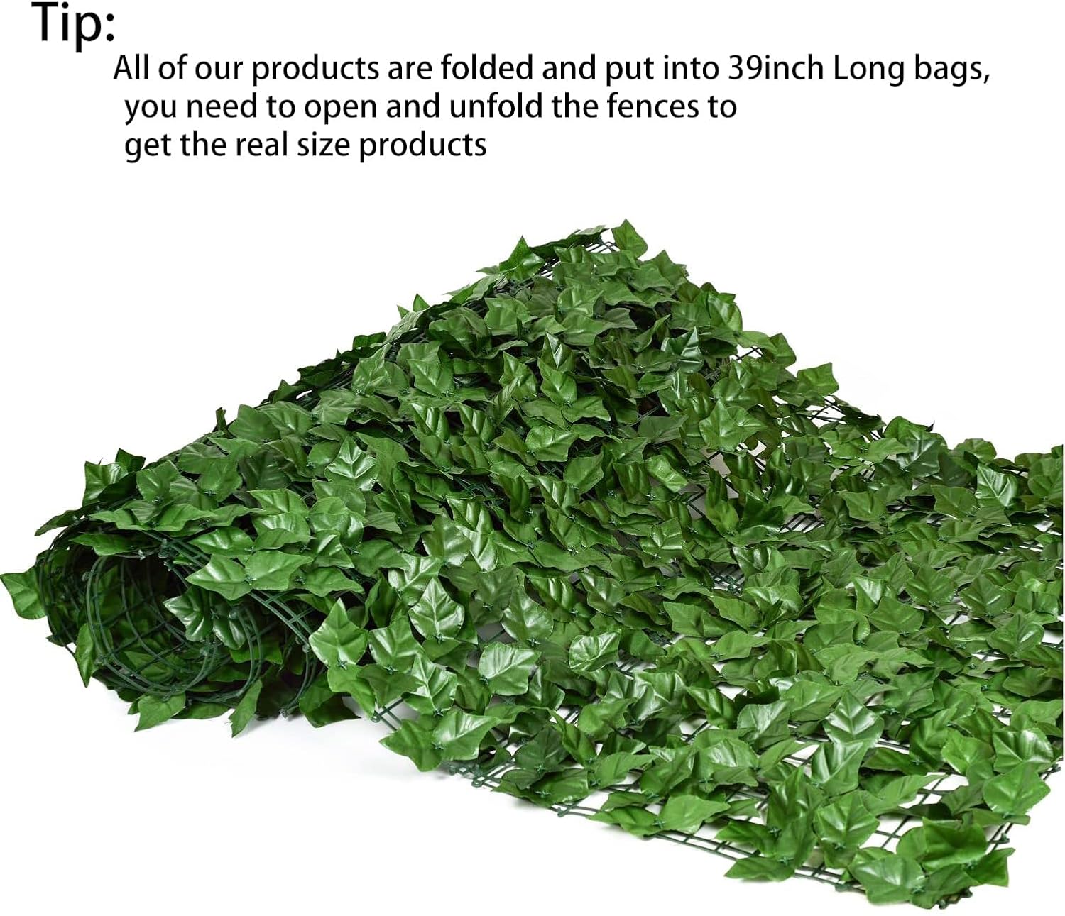 - Realistic green Ivy look: Artificial ivy leaves are natural looking to provide every indoor or outdoor space a blooming, earthy feel without the need for watering,Use zip ties or tape to install, it can be cut to get the size and shape you want, can be used as wall decoration, fence, privacy screen.Tip:All of our products Size are folded and put into 39inch Long bags, when you receive the product, you need to open and unfold the fences to get the real size products.