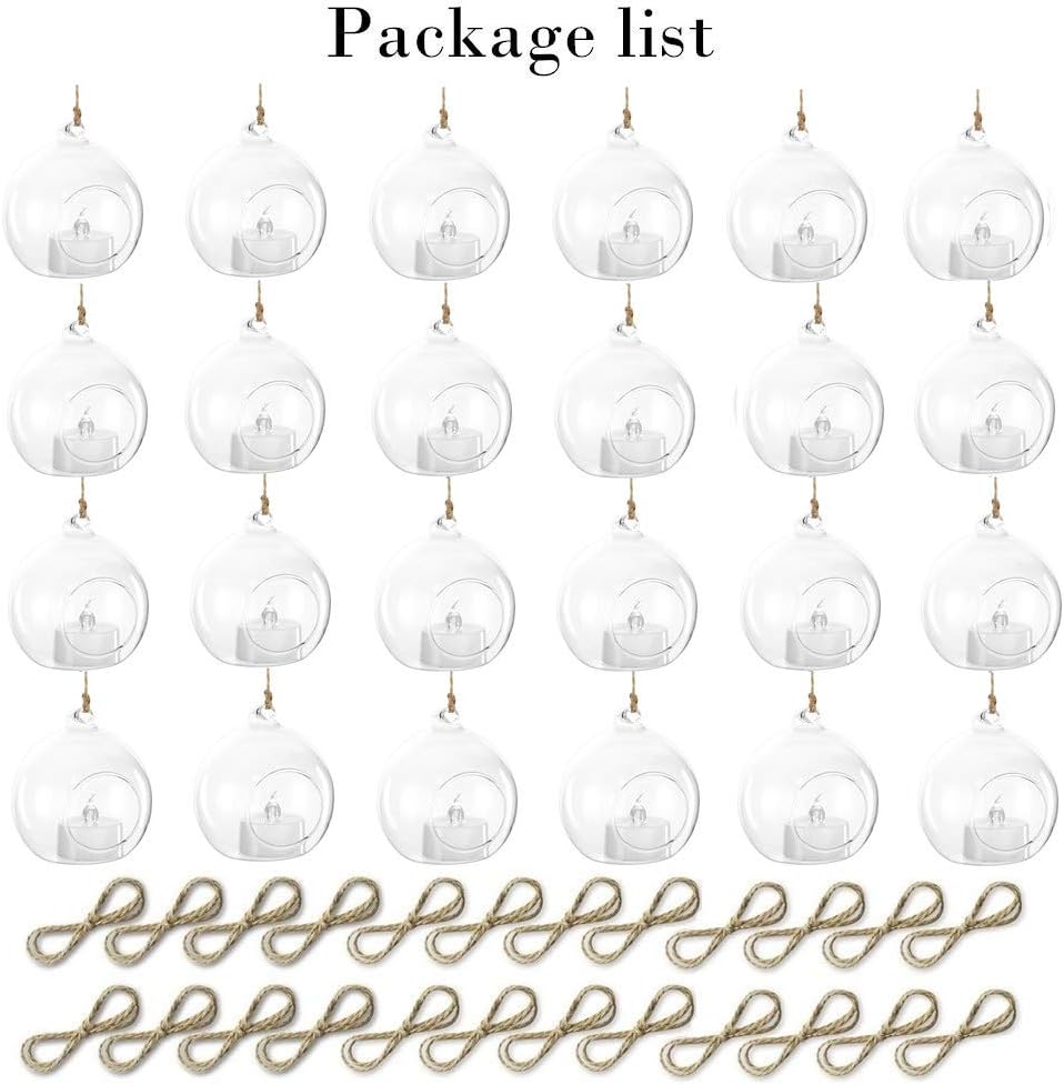 - Package Includes: You will receive 24 Pcs candle holder ,24 Pcs LED tealight candle and 24 x 3.28 Ft jute twine strings. Candles are included. It will be a perfect match to use this glass ball with LED candle.