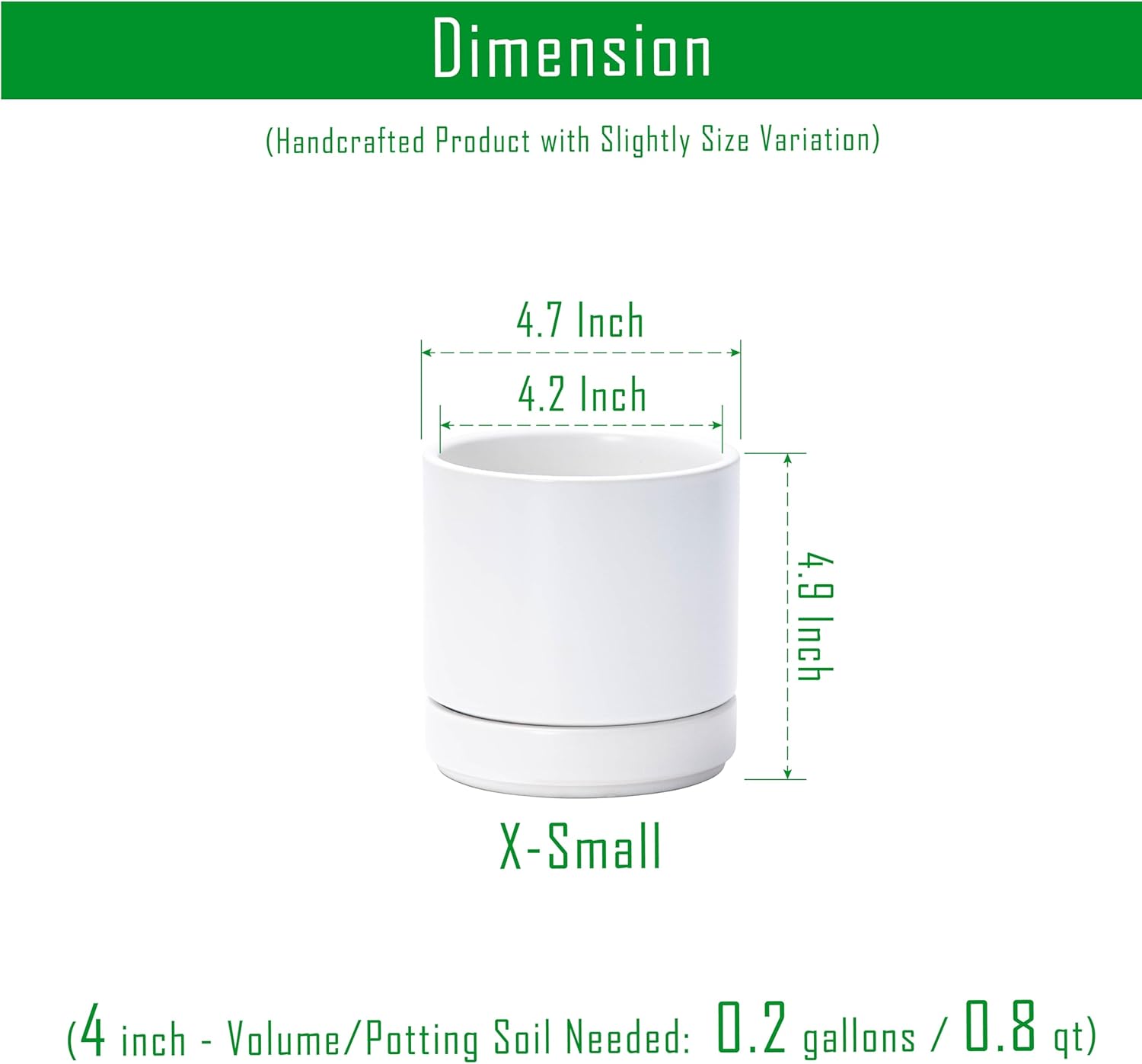 - X-Small 4.7 Inch Planter Pot: 4.7" Diameter x 4.9" H, white color. Potting Soil Needed: 0.2 gallons / 0.8 qt.