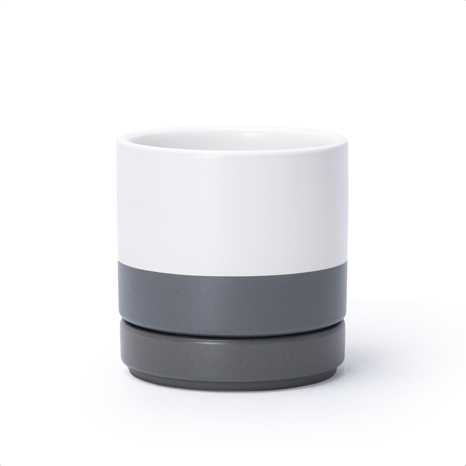 D'vine Dev 4.7 Inch Ceramic Planter Pot with Drainage Hole and Saucer, Indoor Cylinder Round Planter Pot, White/Speckled Grey, 94-O-B-6
