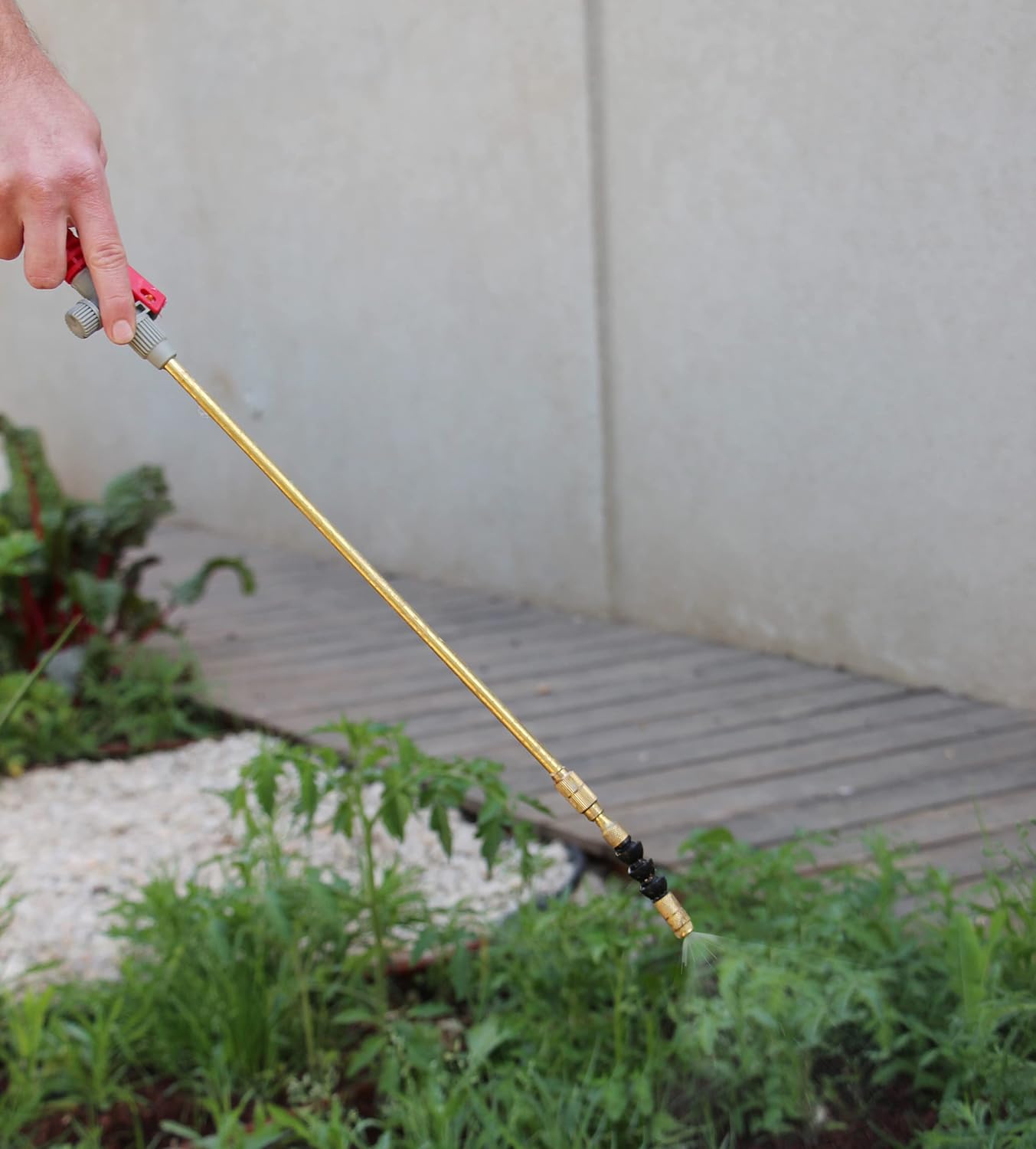 - TELESCOPIC EXTENDABLE SPRAYING WAND: Enjoy a better reach and work standing up straight with the help of the adjustable brass sprayer wand (total length including handle 23 1/2"- 34 1/2"). The comfort-grip handle has a locking trigger, so you can rest your hand while keeping a constant continuous flow. At the tip, you can adjust the water spray intensity by rotating the nozzle from water mist to water jet. The 1 1/2" rubber part at the tip allows for 360° flexing for extra angling options.