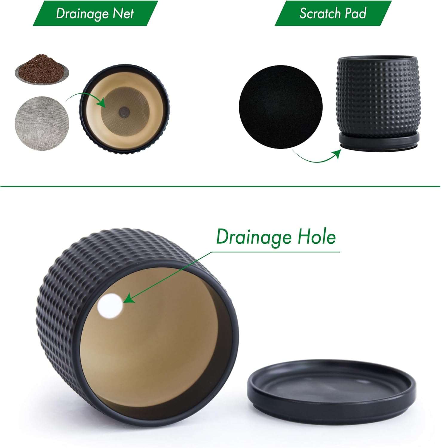 - >> Drainage Net and Pad - A stainless-steel drainage mesh net is also included to prevent soil from falling off the pot. Another protective pad is included to protect tabletop wood surface from scratches.