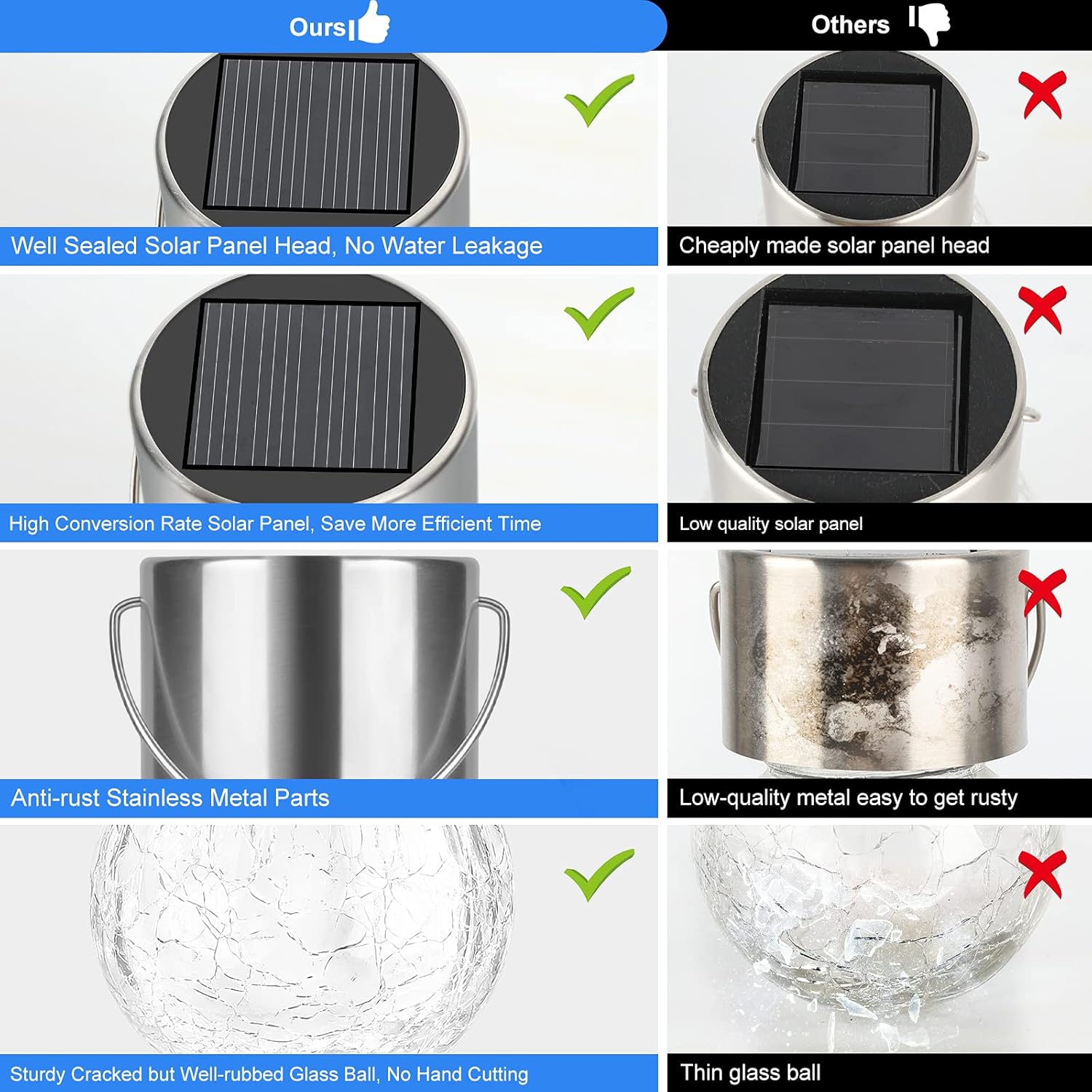 - 【Waterproof & High Quality】-Made of sturdy glass and stainless steel, these solar globe lights outdoor stay under the sun, rain, snow, ice and wind, or even in the worst weather conditions. Combines with the well-sealed solar panel craft, these outdoor solar lantern with a strong waterproof function, you have no need to worry water leakage or frequent replacement. Non-toxic & environment friendly materials, do no harm to your health.