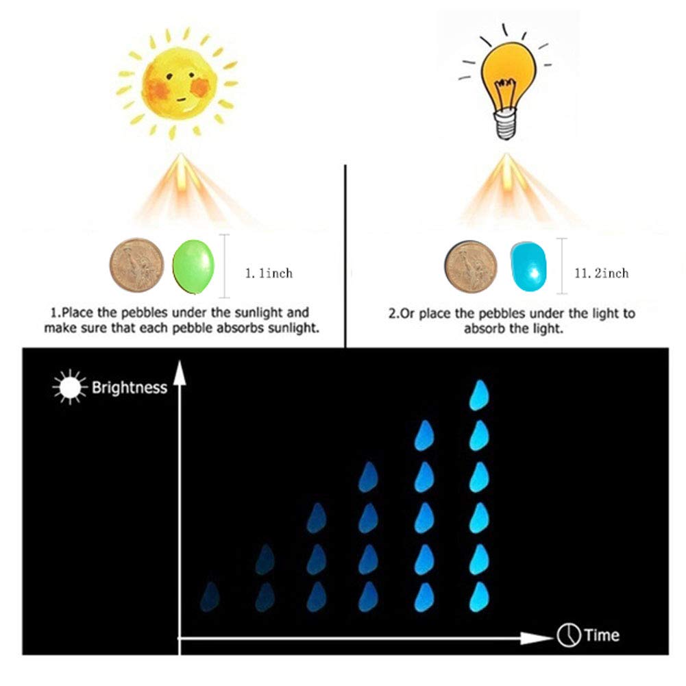 - GLOW IN THE DARK PEBBLES: These glow pebbles absorb and storage energy from sunlight and other light sources,light up in dark night. Let the pea gravel absorb enough sunlight or artificial light at least for 4 hours, and pave them along the pathway. They will emit brilliant glow at night and transform your garden into a beautiful and dreamy landscape!