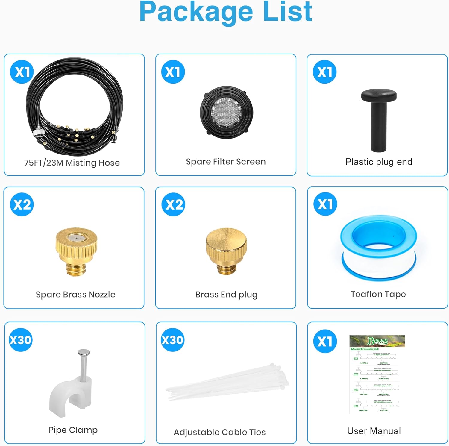 - 🏡 75FT Misting System For Large Setups: Equipped with 75FT (23M) tubing and 28 high-quality brass nozzles, great for cooling large patios, greenhouses, trampolines, umbrellas, pet zones, and more. Effective and easy to install.