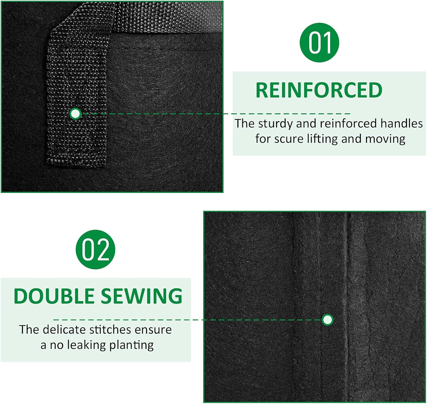 - Handle process: Wide polypropylene ribbon handle, better tension, handle reinforcement lining, easy to move bags filled with soil and plants