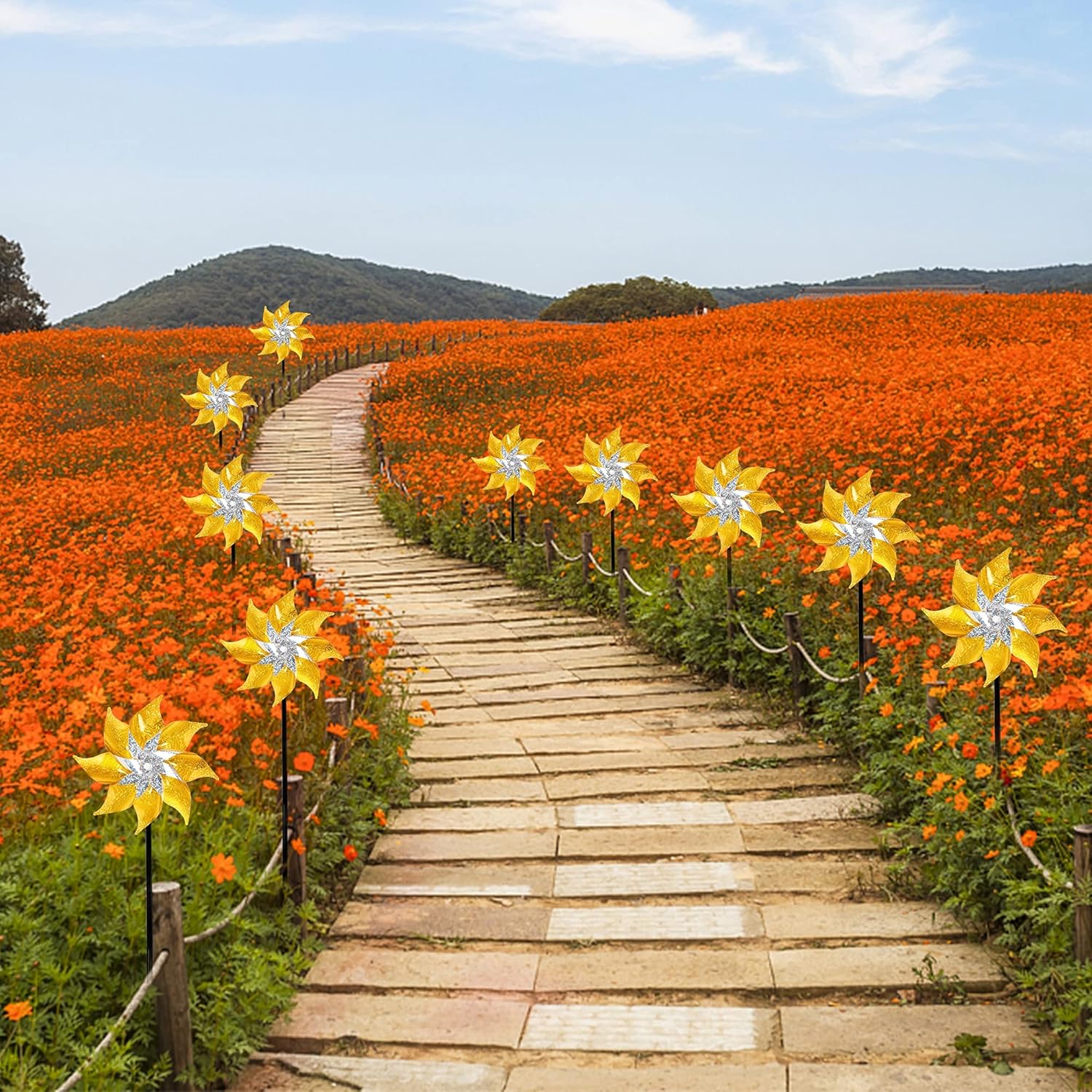 - 10 Pack Golden Reflective Pinwheels: Our visual reflective ornamental pinwheel uses wind motion and light reflections to keep birds away coming from any angle. 10 pack shiny reflective Mylar pinwheels can rotate easily in the breeze, protect your garden, farm, and lawn by creating a bright flash that scares away birds
