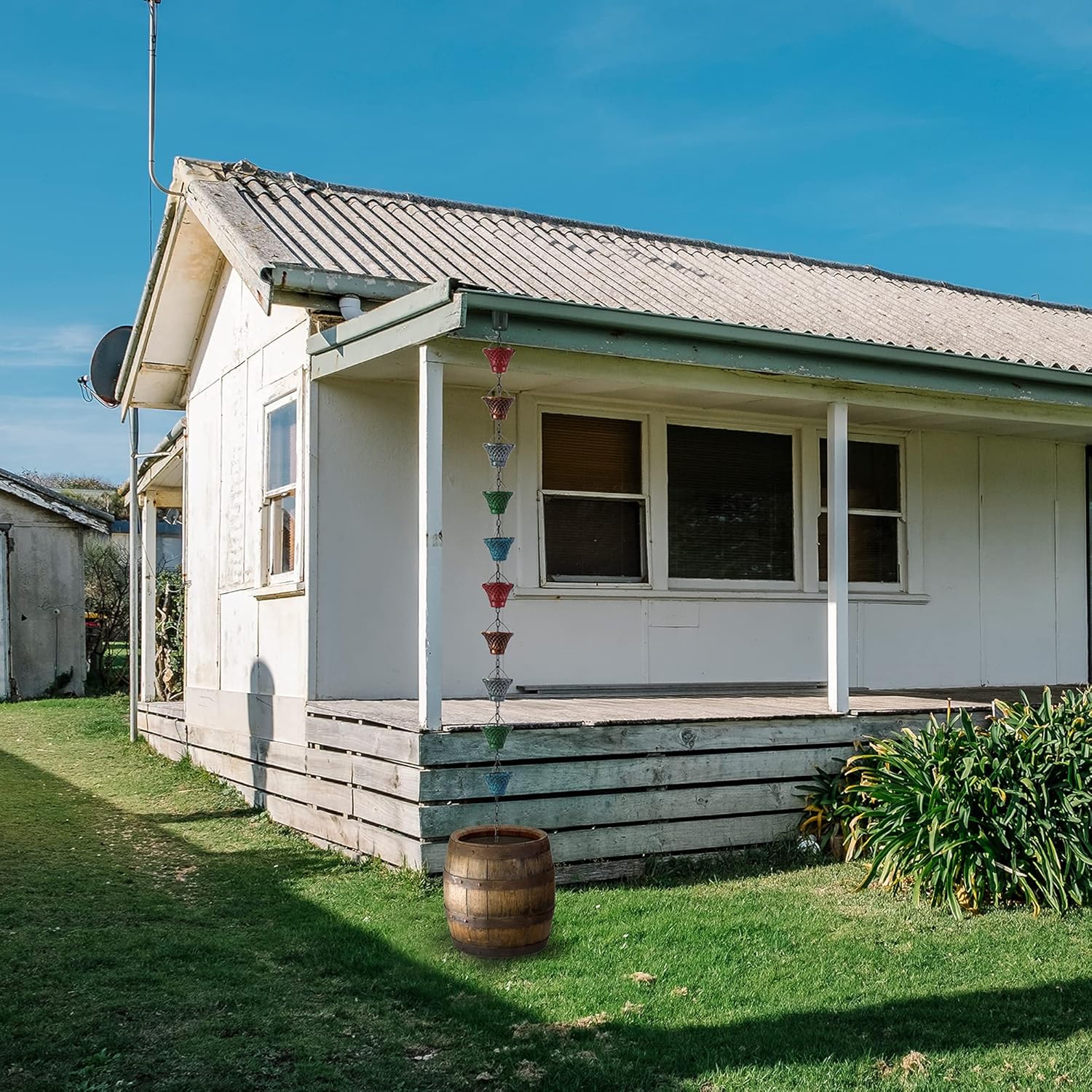 - ANTIQUE DESIGN: Our rain chain is painted in 5 antique colors (Copper, Sky blue, Gray, Red, and Green) to complement your roof and garden decor. The 5.8-foot chain is easy to adjust by adding or removing cups or links.