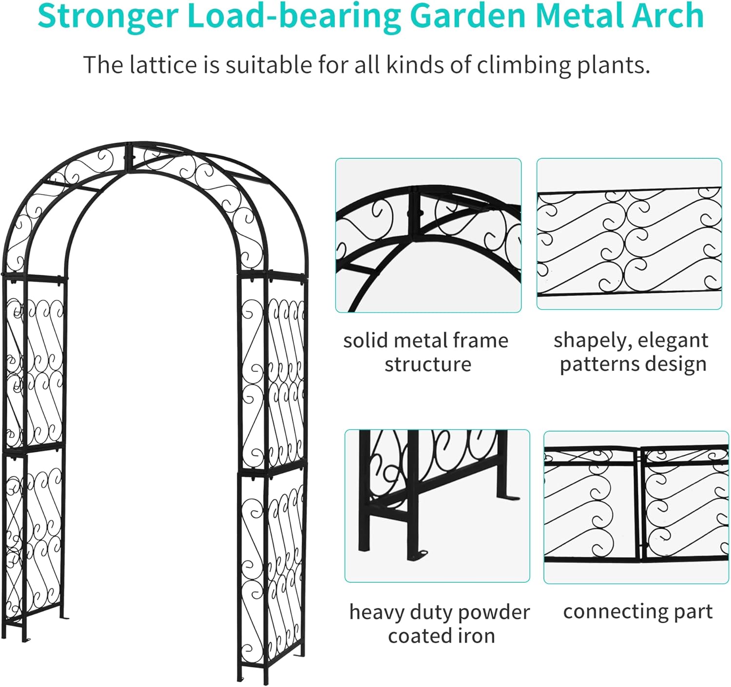 - 【Elegant Arch】Whether standing alone or covered with climbing vines and flowers, the outdoor metal trellis arch add a striking focal point to your yard.Creates an graceful entry to your garden or yard even without climbing plants, beautiful in all seasons.