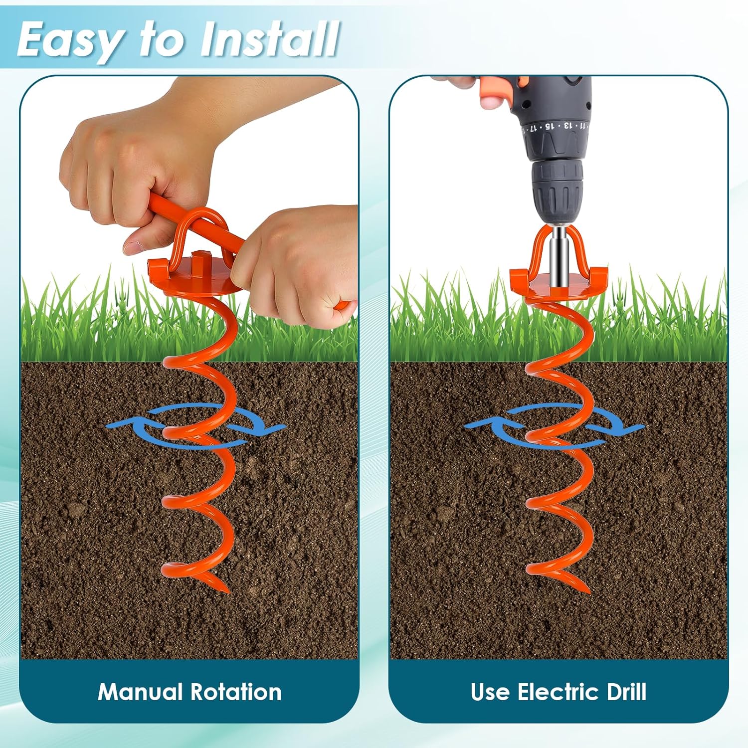 - Easy to Install & Use: Our screw in ground anchors are specially designed for versatile installation options. Simply insert the tip into the ground, put the handle through the top ring and get imbed with a few rotations. Or, you can connect the hexagon ground head to your electric drill for a more effortless installation. Please note: Drill and adapter are not included.