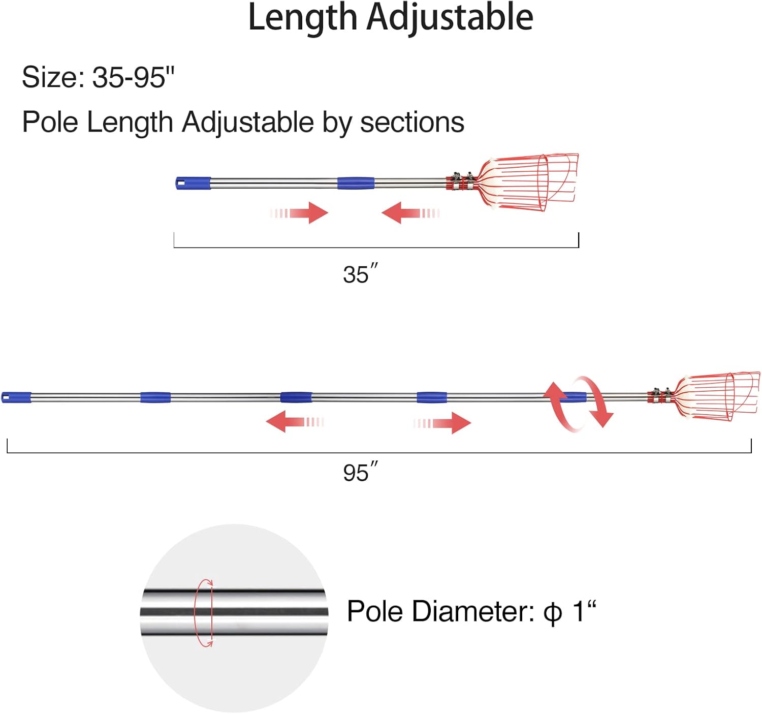 - ▼【Length Adjustable】Cherry picker tool length is adjustable by sections to be 35" to 95" which is safer and more efficient to get fruit from tall trees without falling off a ladder any more.