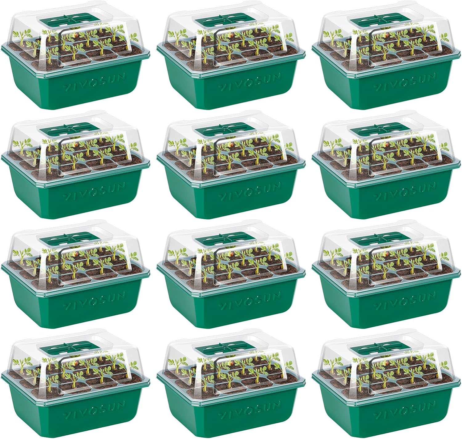 VIVOSUN 12-Pack Seed Starter Trays, 144-Cell Seed Starter Kit with Humidity Dome, Flat Reusable Plant Germination Trays with Drain Hole, Green Propagation Tray for Planting Seeds