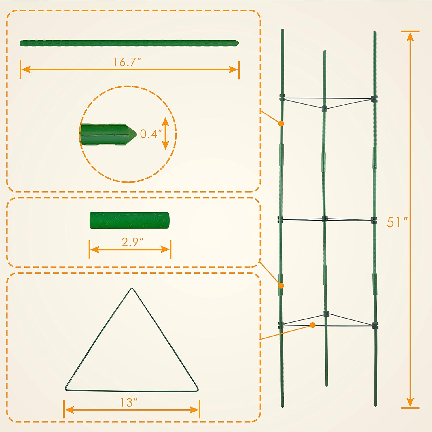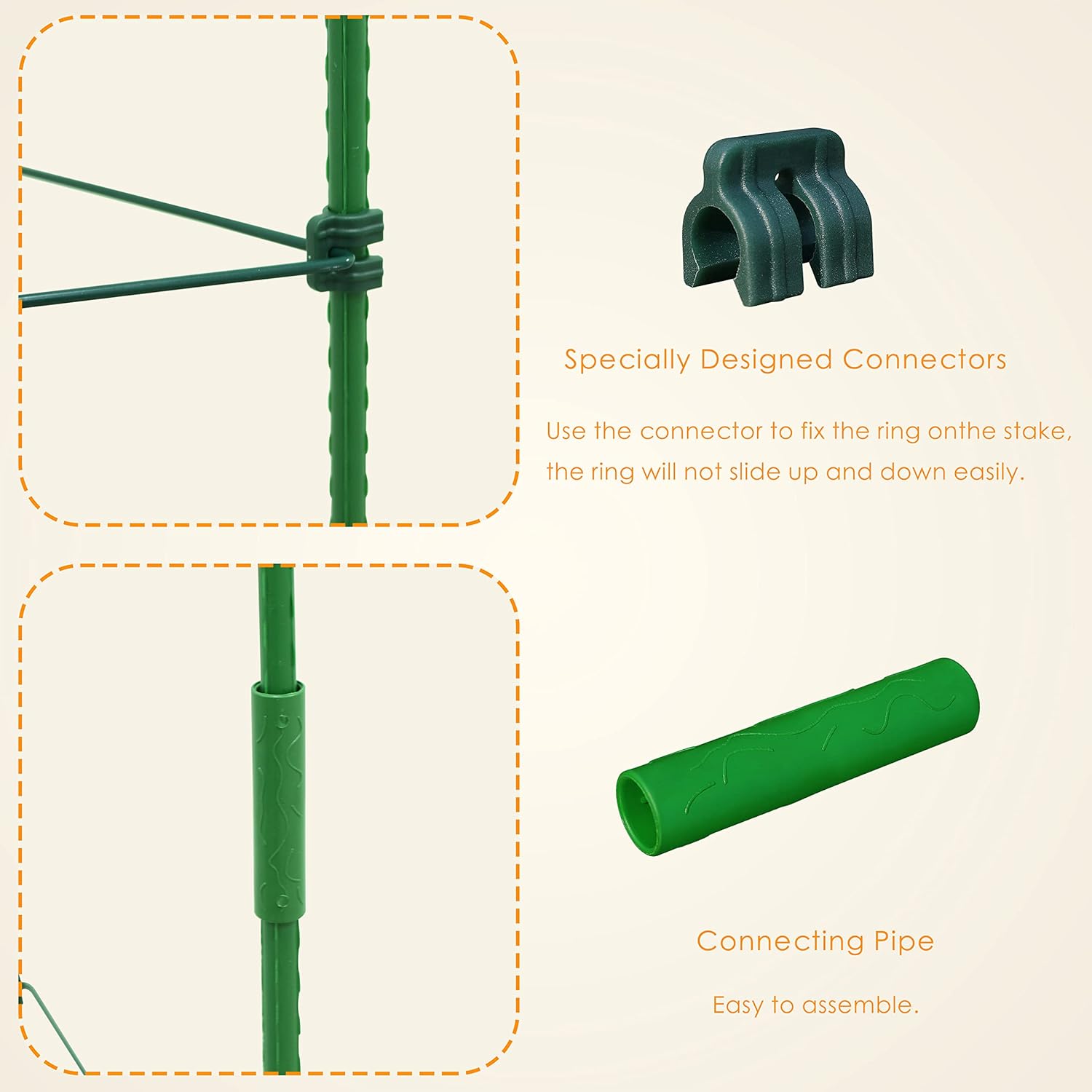 - Easily Disassemble for Convenient Storage - Simply connect a certain number of stakes with connectors according to your needs. Place stakes several inches into the soil. Snap triangular rings to stakes with connectors. Gradually add or adjust height as the plant grows. Easy to save it after dismantling.
