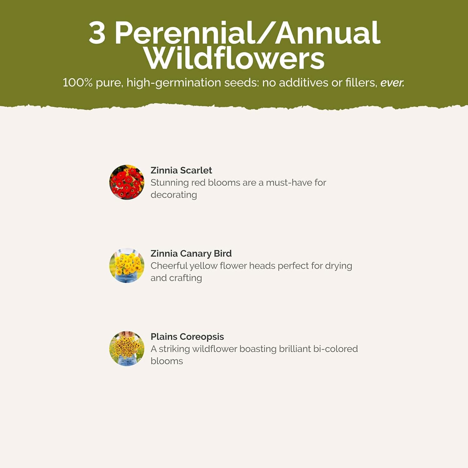- 100% Pure, Non-GMO Seeds - No fillers, favorites only! Includes 3 easy-to-grow species: Zinnia Scarlet Flame, Zinnia Canary Bird, Plains Coreopsis