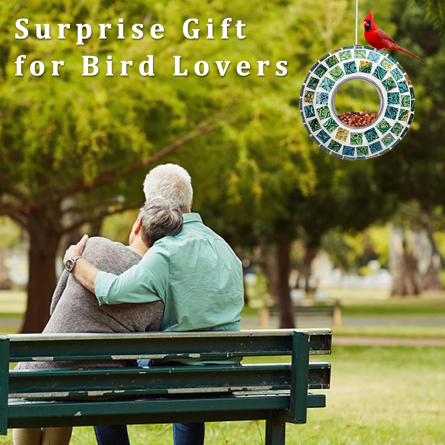 - Hanging Bird Feeder: Mosaic hang bird feeders for outdoors is made of strong mortar and glass. Birds can eat from the rim or hop inside during bad weather