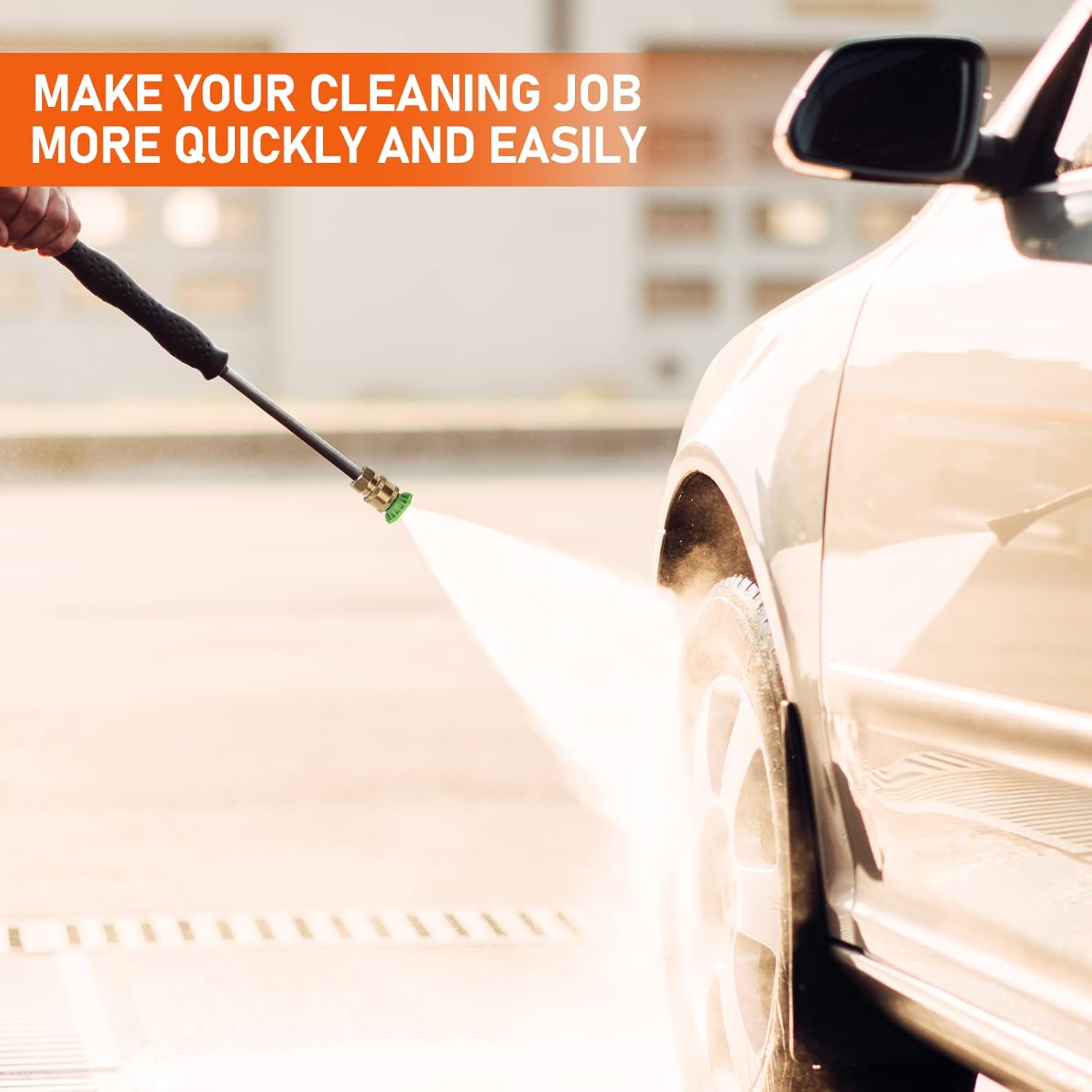 - â ăMULTIPLE DEGREEă-Increase cleaning efficiency and spend less time on cleaning using the multiple degrees nozzle tips set: 65°for detergents, 40°for windows and screens, 25°on painted surfaces, wood, siding fences and lawn mowers, 15°on concrete, briks and other hard surfaces with stubborn stains and 0°for high and hard to reach areas.