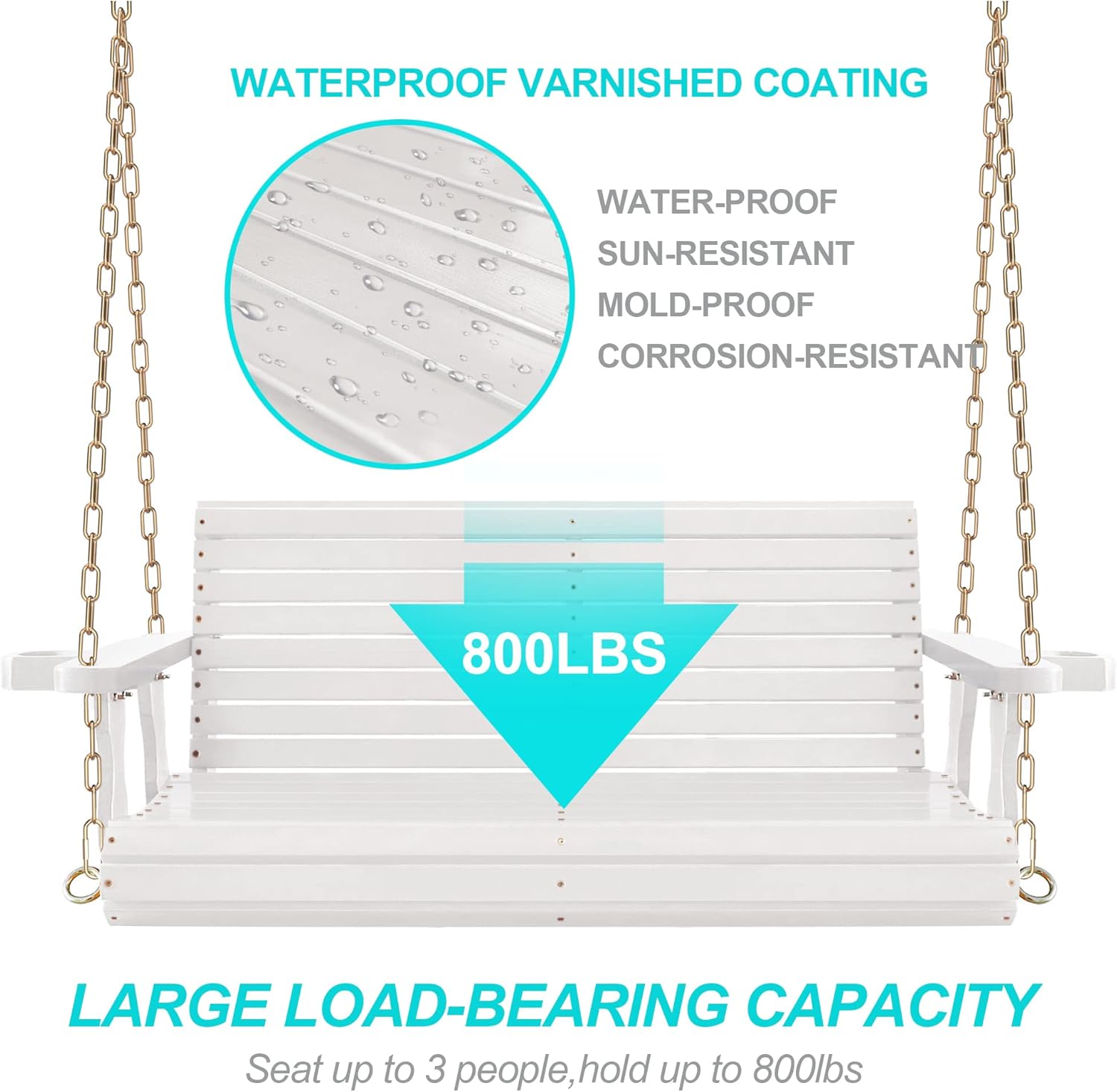 4FT Wooden Porch Swing w/Cupholders,Heavy Duty 800LBS Outdoor Swing Bench w/Chains,Patio Roll Back Swing Chair Bench,Front Porch 2-Person Hanging Bench,for Garden Courtyard Lawn & Balcony