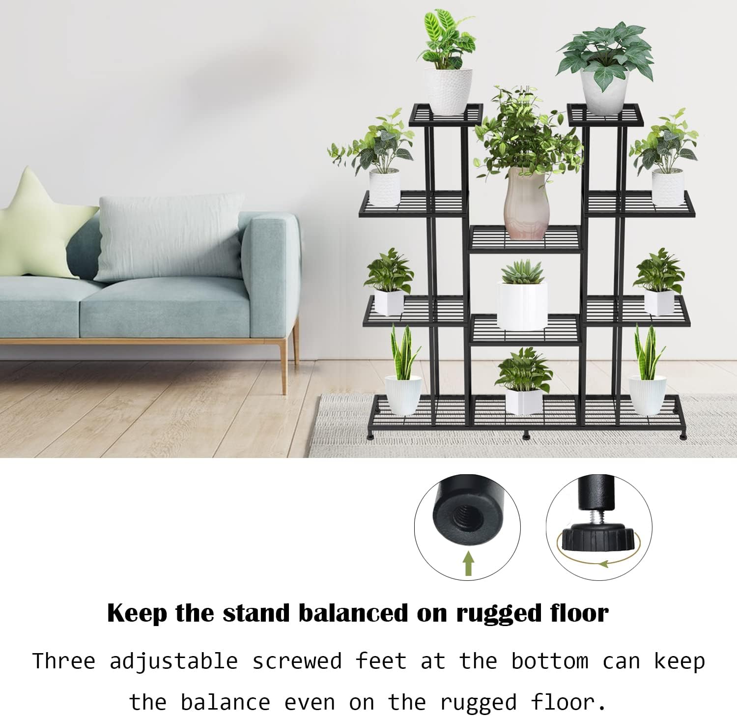 - 【9 TIER LARGE CAPACITY】size: W 43.8 x H 47 x D 9.8 inch,weight at 15 lbs;Each rack is wide and spacious enough to hold most pots.Multi layer high and low garden plant shelf with opening design,no shelter from each other,easy to handle and water,helps plants get enough sunlight for growth.(The plant organizer can hold up to 17 pot plants.)Space-saving, you can place in corner of the living room, garden, balcony and bedroom. Perfect for decorating your home.