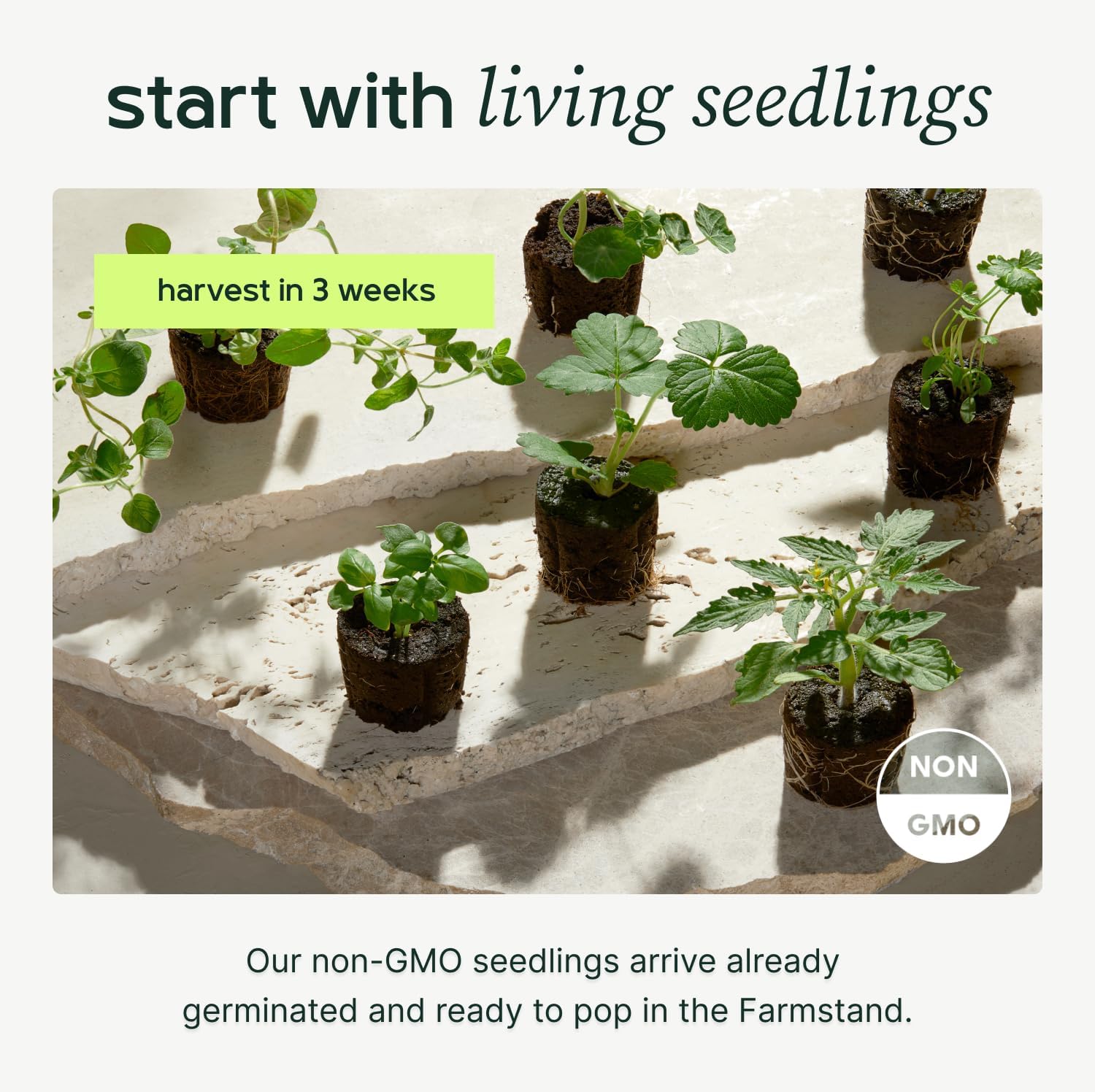 - 18 SEEDLING CREDITS: This starter kit includes a unique QR code on your Farmstand packing slip with instructions to redeem 18 seedlings from our website. Your special seedling bundle includes the best veggies, leafy greens, herbs, fruits and lettuce of the season. These pesticide free, non-GMO, pre-grown plants will have you harvesting 3 weeks early and help ensure your success. Seedlings not shippable to U.S. outlying territories.