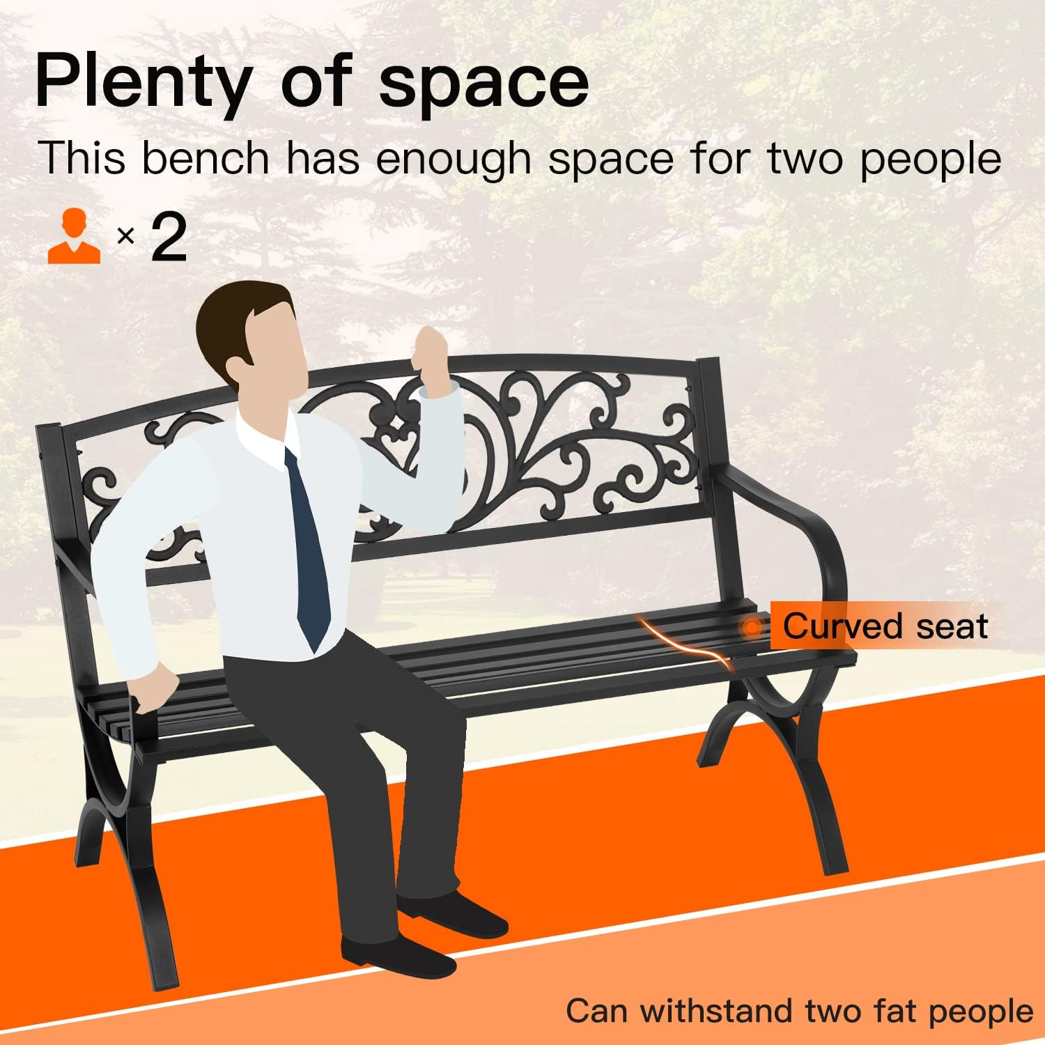 - ăSturdinessăThe Park Bench is made of reinforced steel to ensure sturdiness and stability, durable and the Metal Bench perfect for use for years.The Garden Bench is powder coated with rust-resistant finish, super smooth. The bench comfortably seats two adults and bears weight to 480 lbs.
