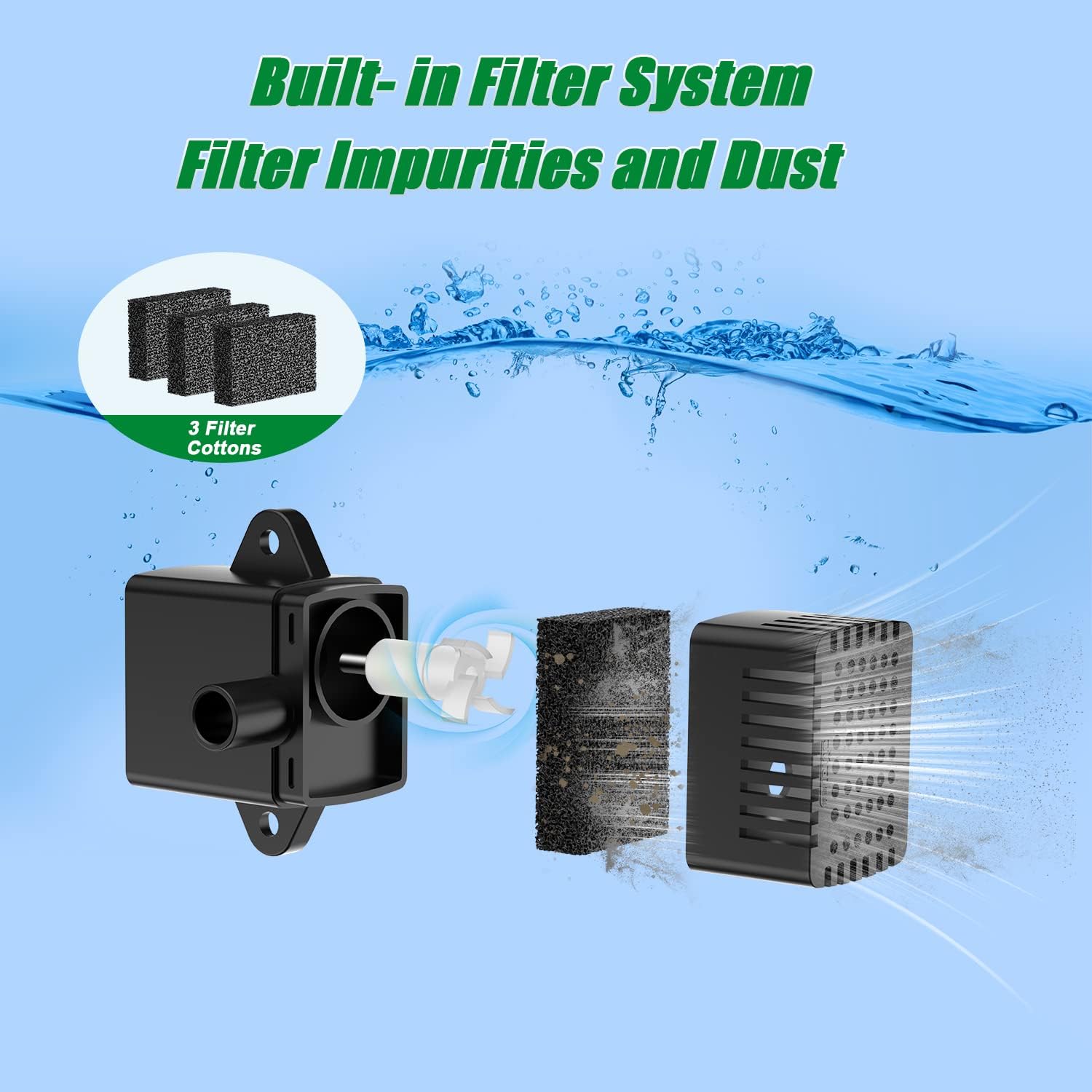 - Blocking Protection System: Solar powered fountain comes with an anti-clogging technology, it will stop working automatically when the filter cotton or rotating shaft is blocked in the direct sunlight; Tips: If the solar fountain stop working, please clean the filter cotton and rotating shaft; Please do not put the solar fountain in a place where there is no water and the sun shines directly to avoid dry working