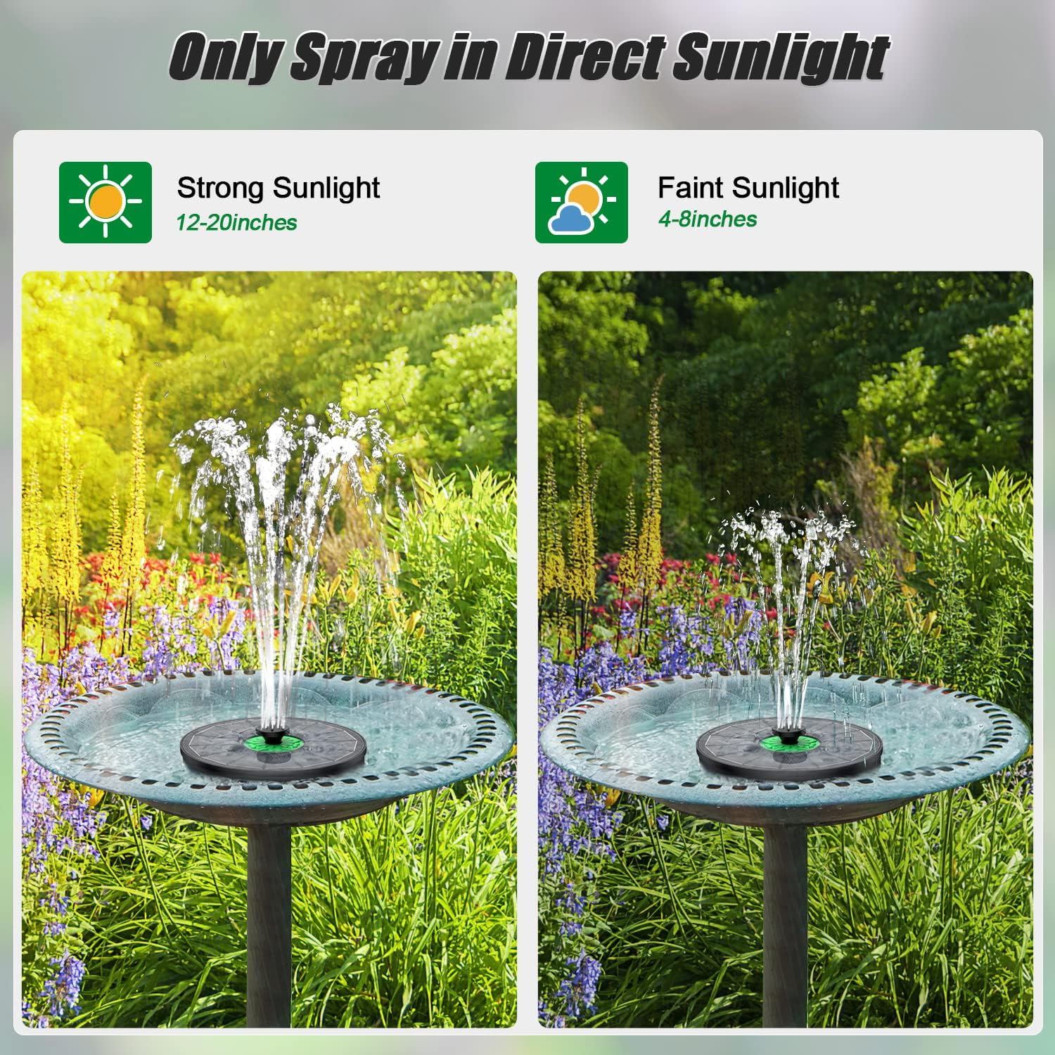 - 7 Spray Styles: With 7 nozzles, you can also DIY the spray style of the solar fountain pump as you like, which can add some fun to your garden; The intensity of sunlight and the water will affect the spray height of the fountain, the normal height is 12-20 inches; If the sun is too strong to cause the solar fountain to spray out of the bird bath, you can put less water in the bird bath