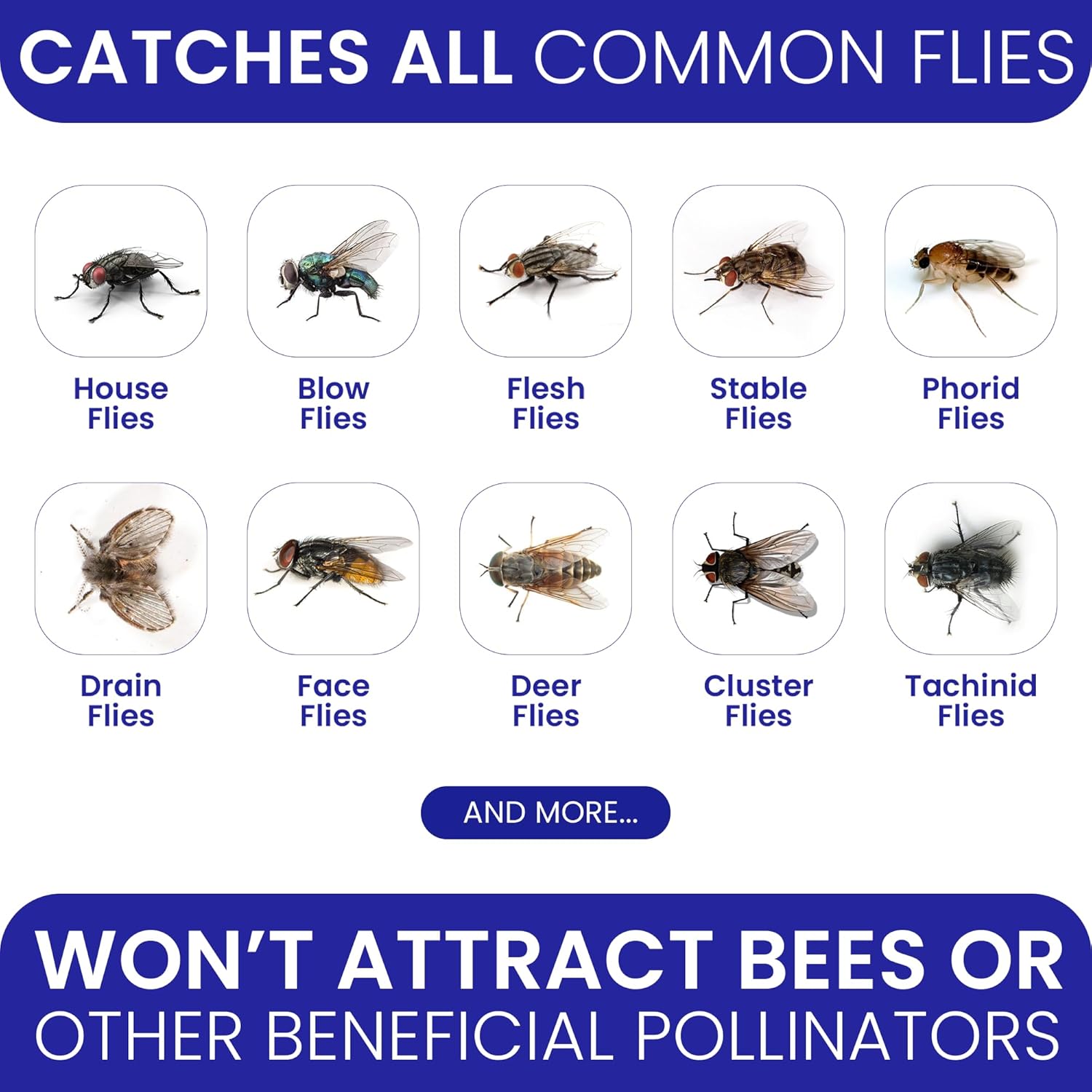 - QUICKLY ATTRACTS ALL FILTH FLIES. Once you add water, the fly catcher outdoor bait dissolves, releasing a smell flies find irresistible. Use as an outside fly traps for patio, house fly trap, horse or ranch fly trap.