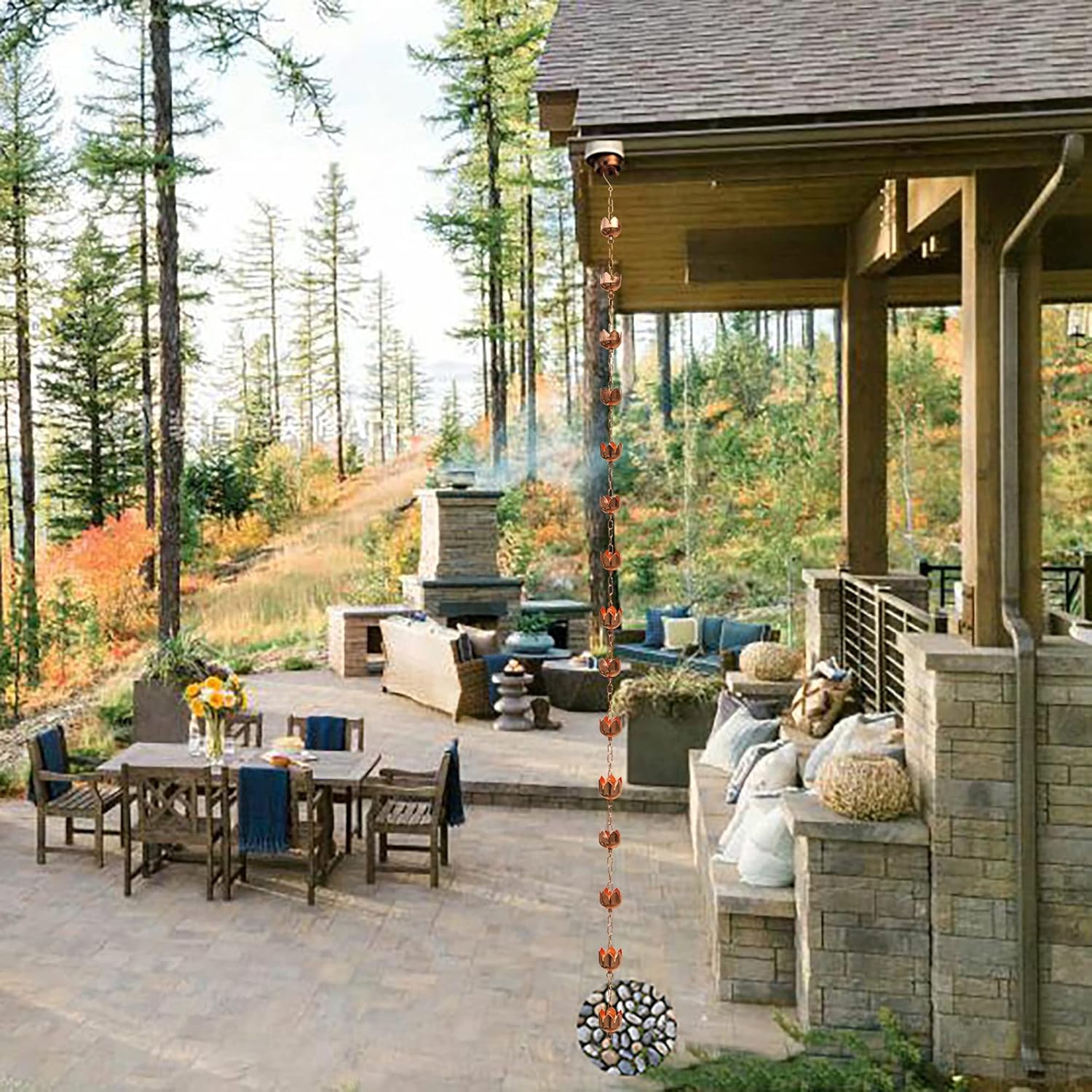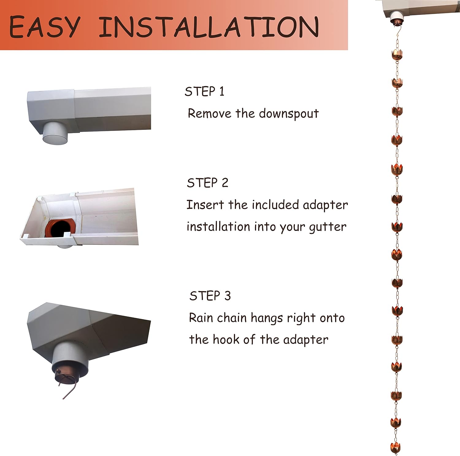 - Easy installation: Modern circular connection technique allows for height adjustment; connect the bottom ring to ground fixture or water basin; hook the top wherever you want to hang rain chain. Free adapter provided.