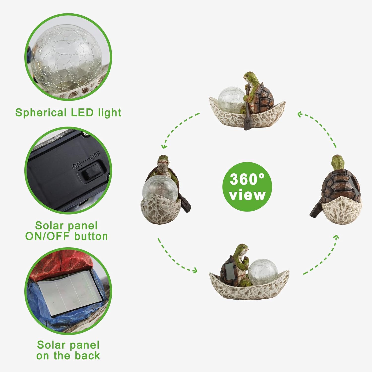 - 【Easy To Use】The patio Turtle ornament which just toggle the bottom switchand leave it in the "on" position in the daytime.The solar Turtle sculpture charge during the day and light up automatically at night.If the led lights don't turn on when you receive it that maybe caused by the long time shipping.Just place Turtle in the sunlight for a few hours,and the problem will be fixed.