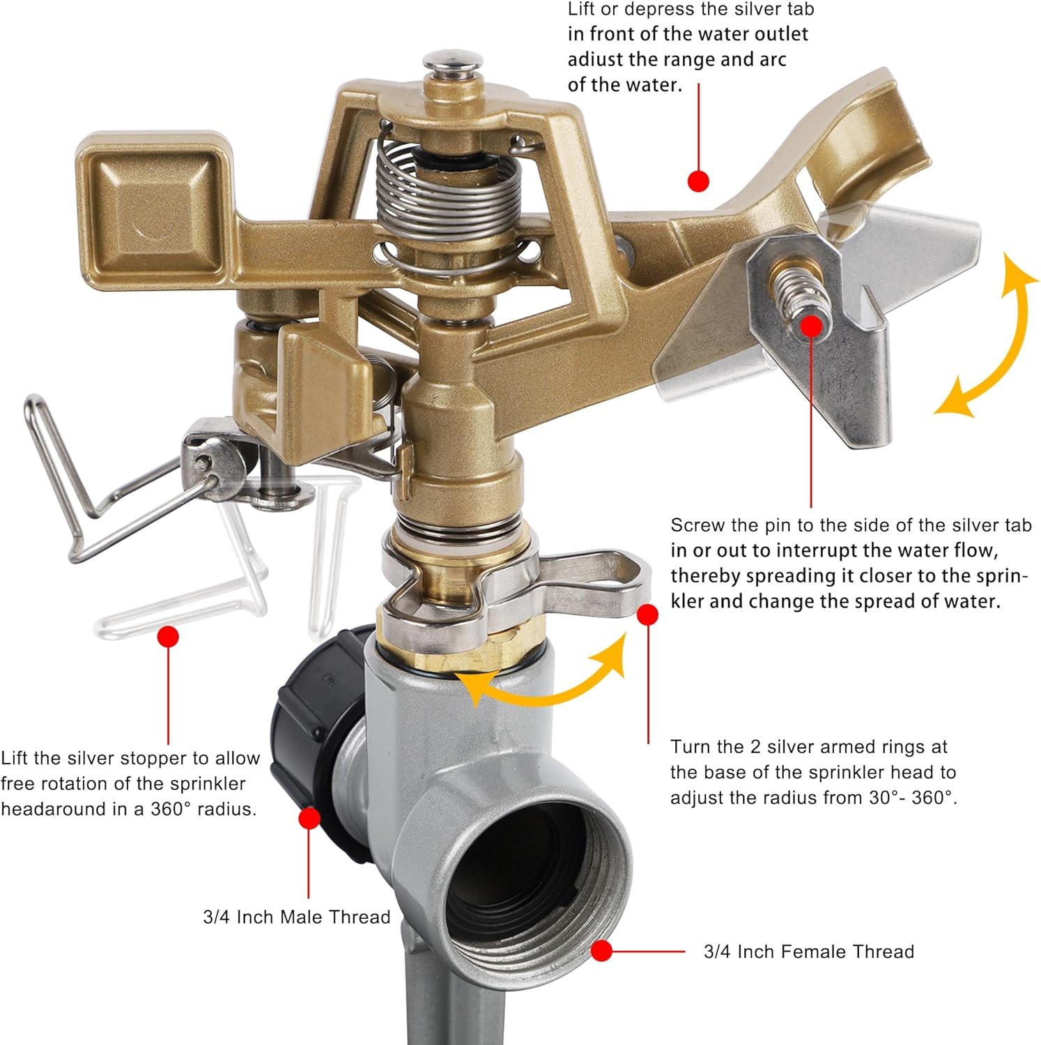 - IMPACT SPRINKLER WITH SPIKE: Heavy duty zinc alloy lawn impact sprinkler head with stand for yard, lawn and grass Irrigation. The lawn sprinkler can be adjusted from full circles of 360 degrees to partial circle patterns that turn 20 degrees to 340 degrees. Adjust the spray range and radian of water to make the irrigation in the garden fun
