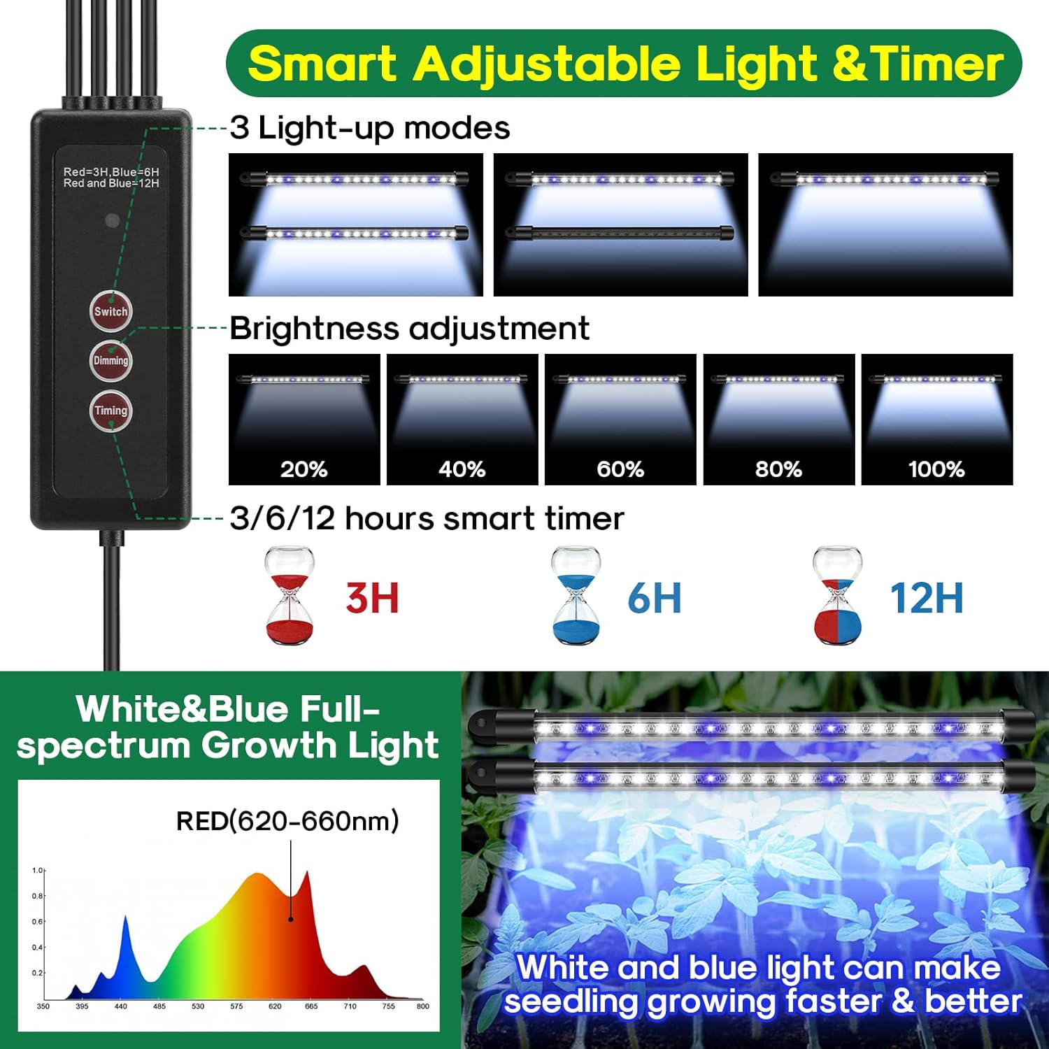 - 【360°Spectrum Seed Starter Tray With Grow Light】 Larger grow light cover spectrum for better seedling grow, the seed started kits have 4 full spectrum strip seed grow lights insert on the Dome of the garden plant starter kit. Now you can adjust and timed the light as you need! Withe& blue Light will help seedling growing faster and better. You can use this product by USB port or just plug-in,3 lighting modes & 3 timing functions (3H/6H/12H) & 5 brightness modes, the best tool for your garden