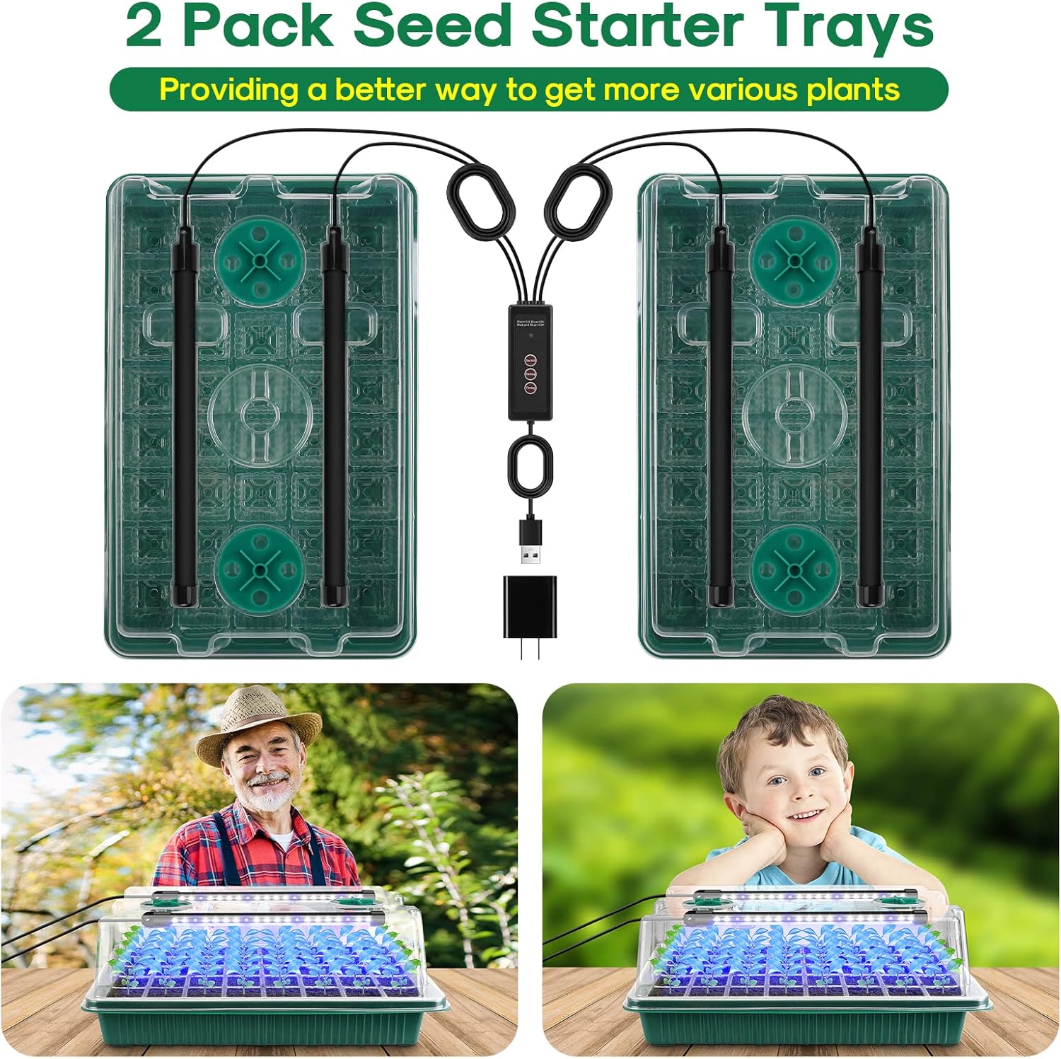 - 【2 Ways to Use,80 Lamp Beads】 This seed starter trays support AC/DC adapter to power on and USB plug-in, 2 ways to use. Our lamp beads is numerous, and you can see on the strips,there is 20 pcs on each light, it can fully illuminate on every seeds, spectrum is 360°. Help your houseplant growth healthier and faster
